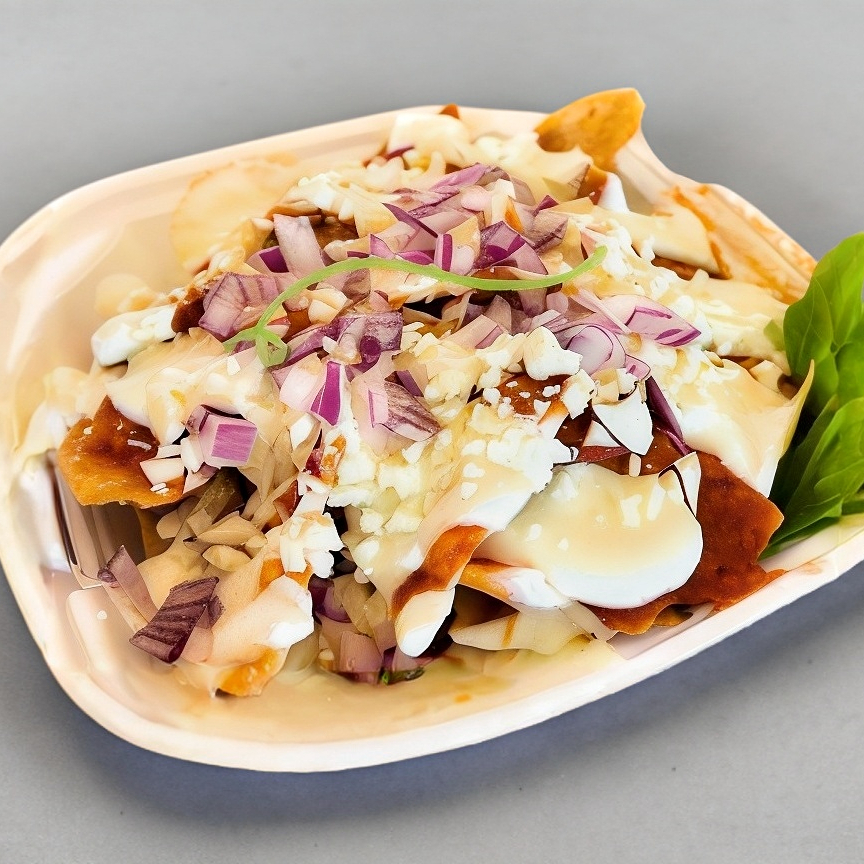 Orden de totopos de maíz bañados en salsa verde acompañados de crema, queso, cebollamorada y cilantro