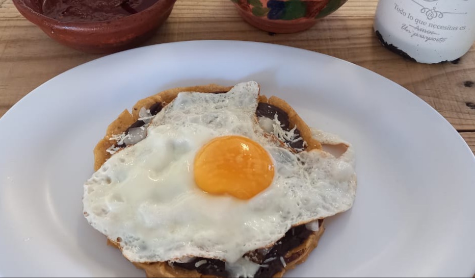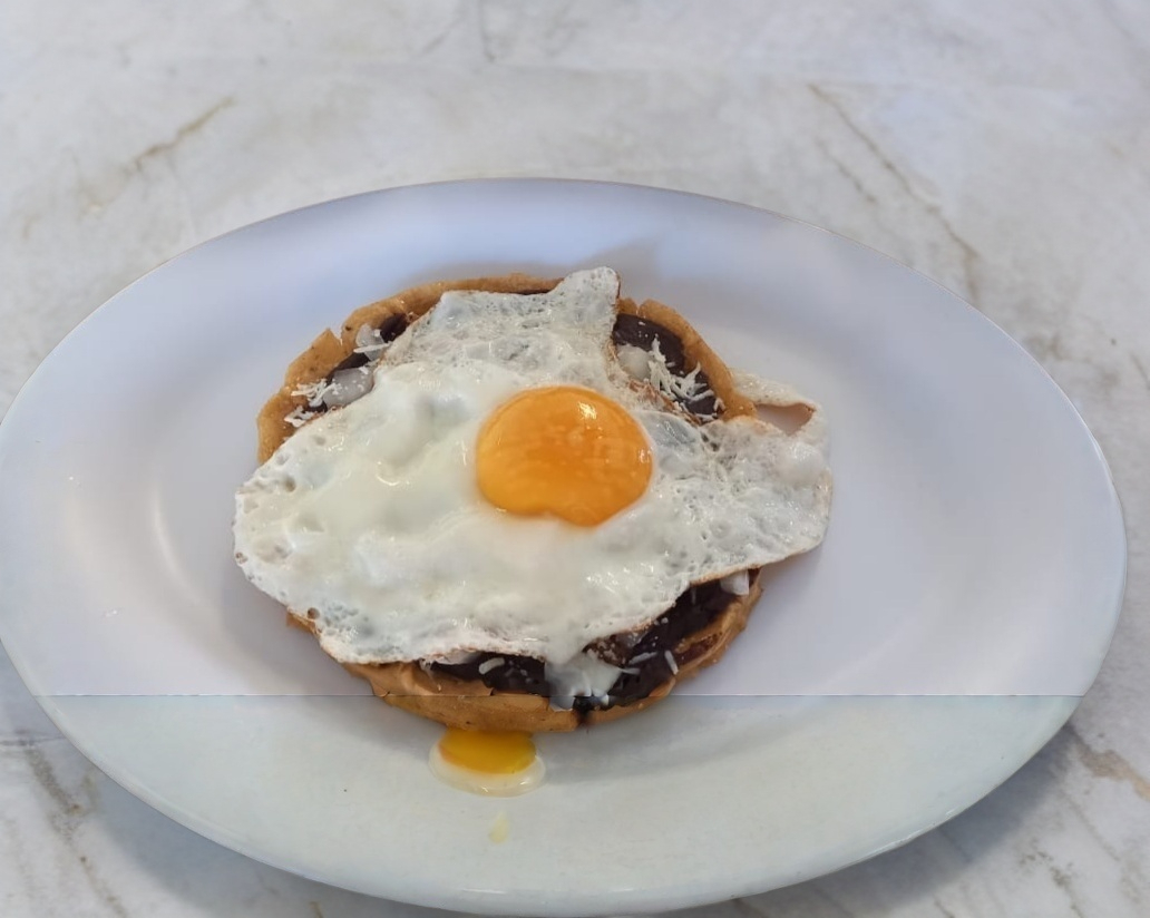 2 piezas, huevos fritos servidos, sobre tortillas de maíz, doradas, bañados en salsa roja y verde con frijoles.