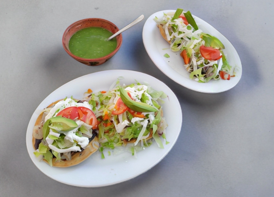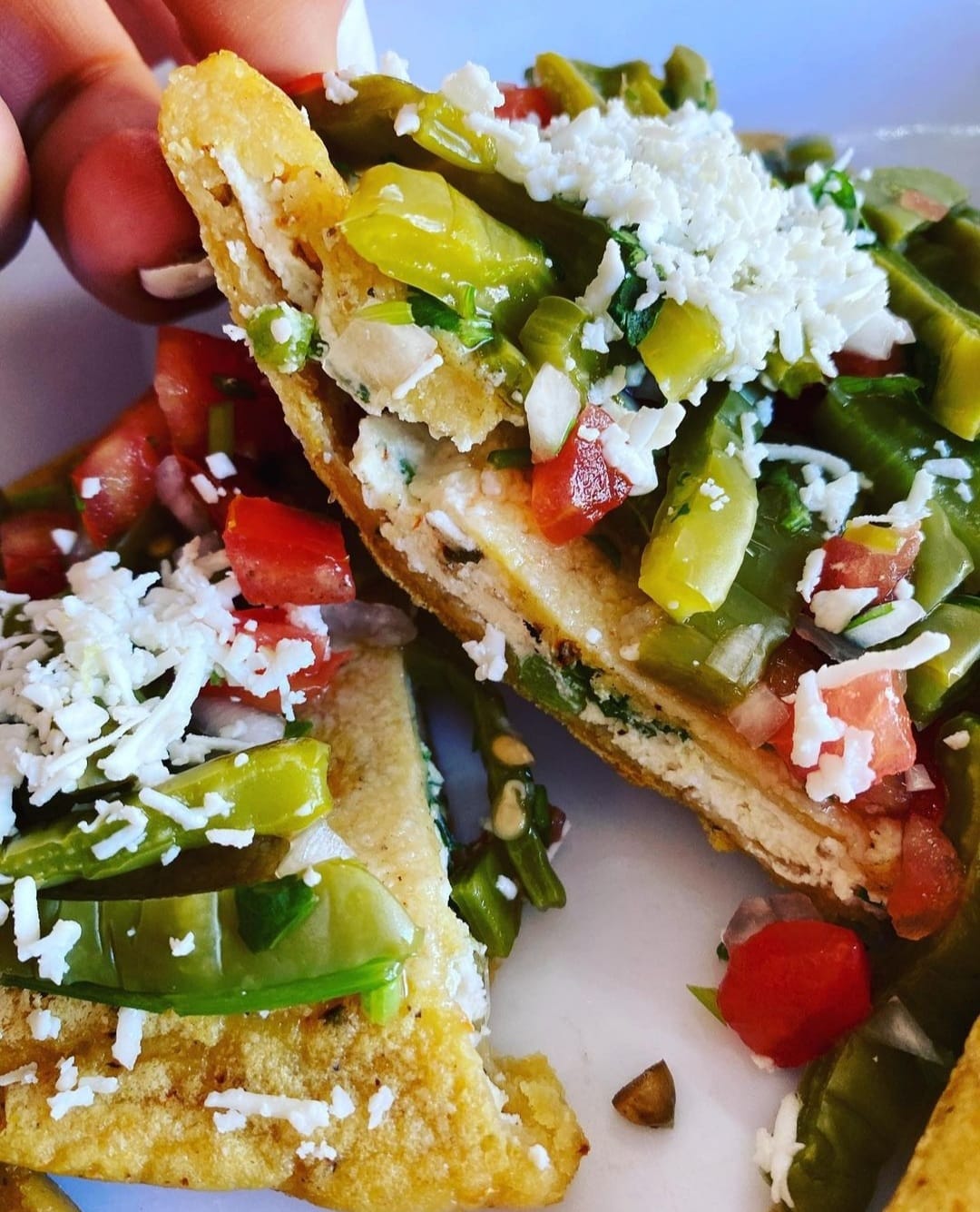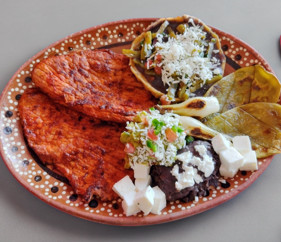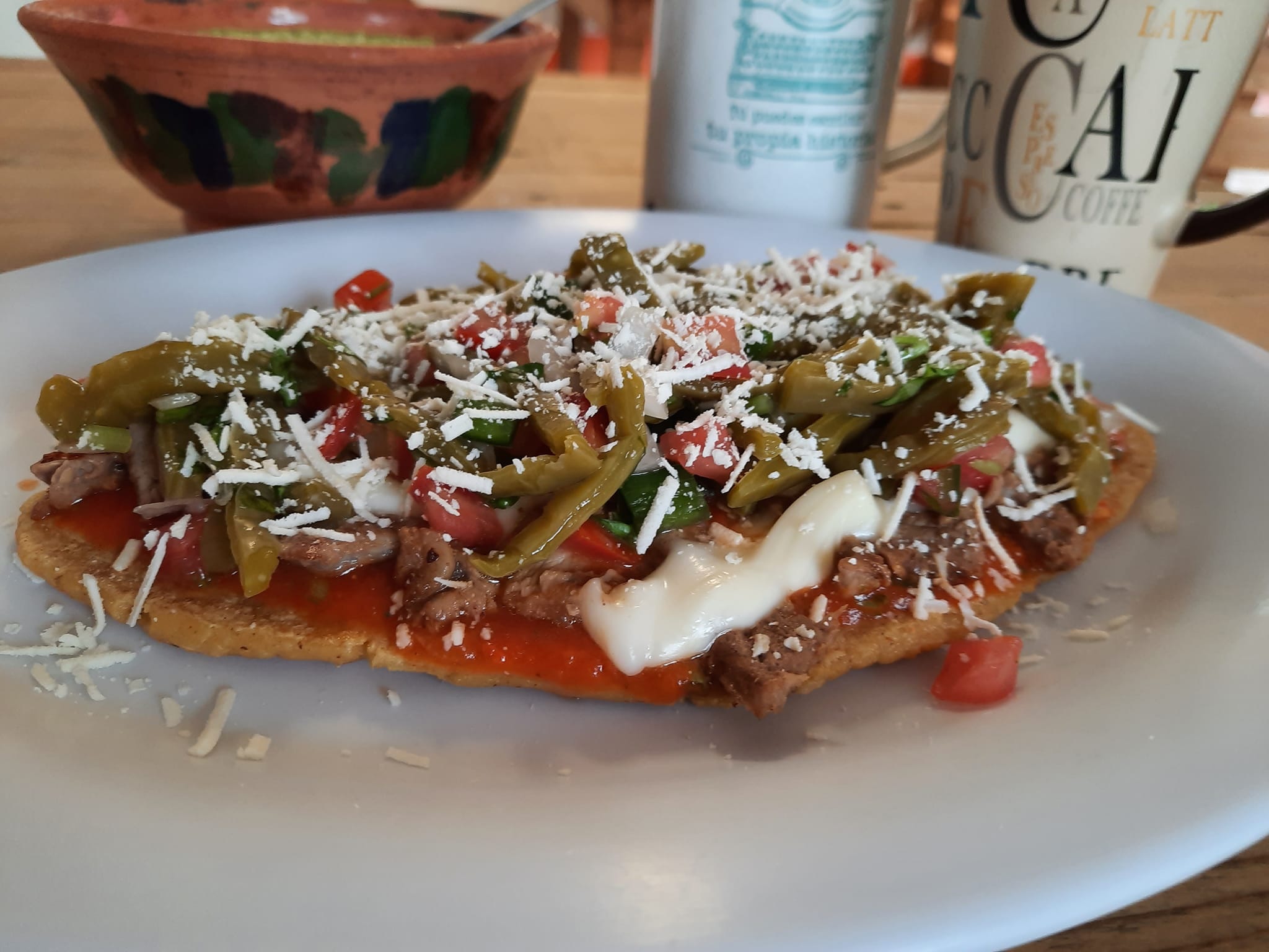 Servida con nopales, guacamole, cebolla cambray, sopecito de nopal, queso fresco y frijoles.