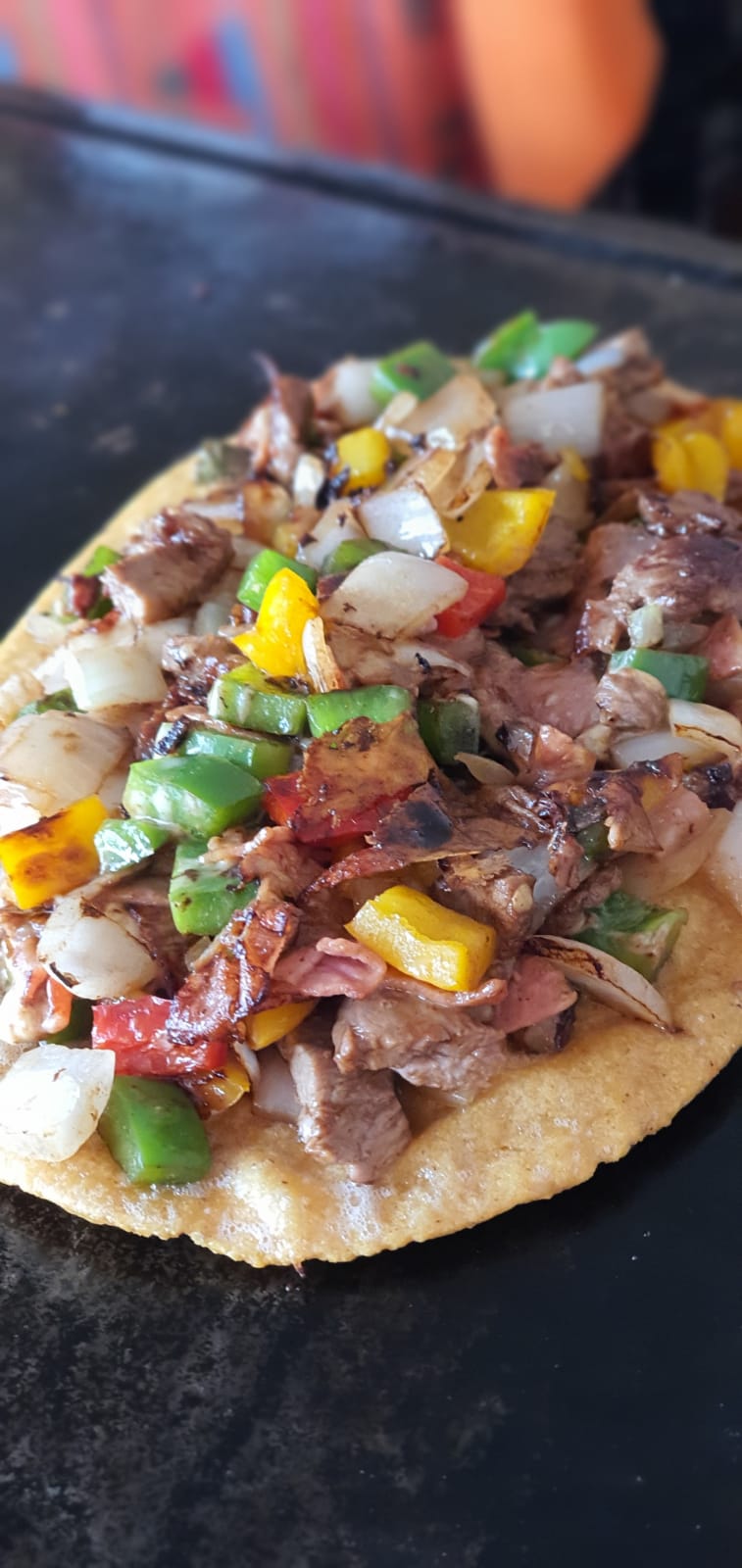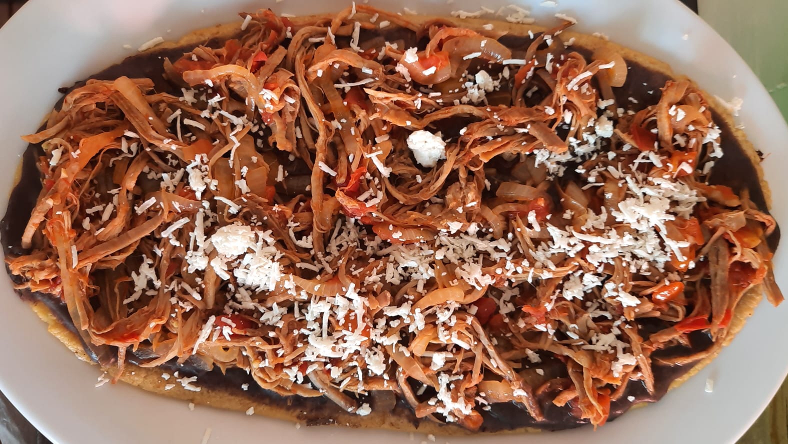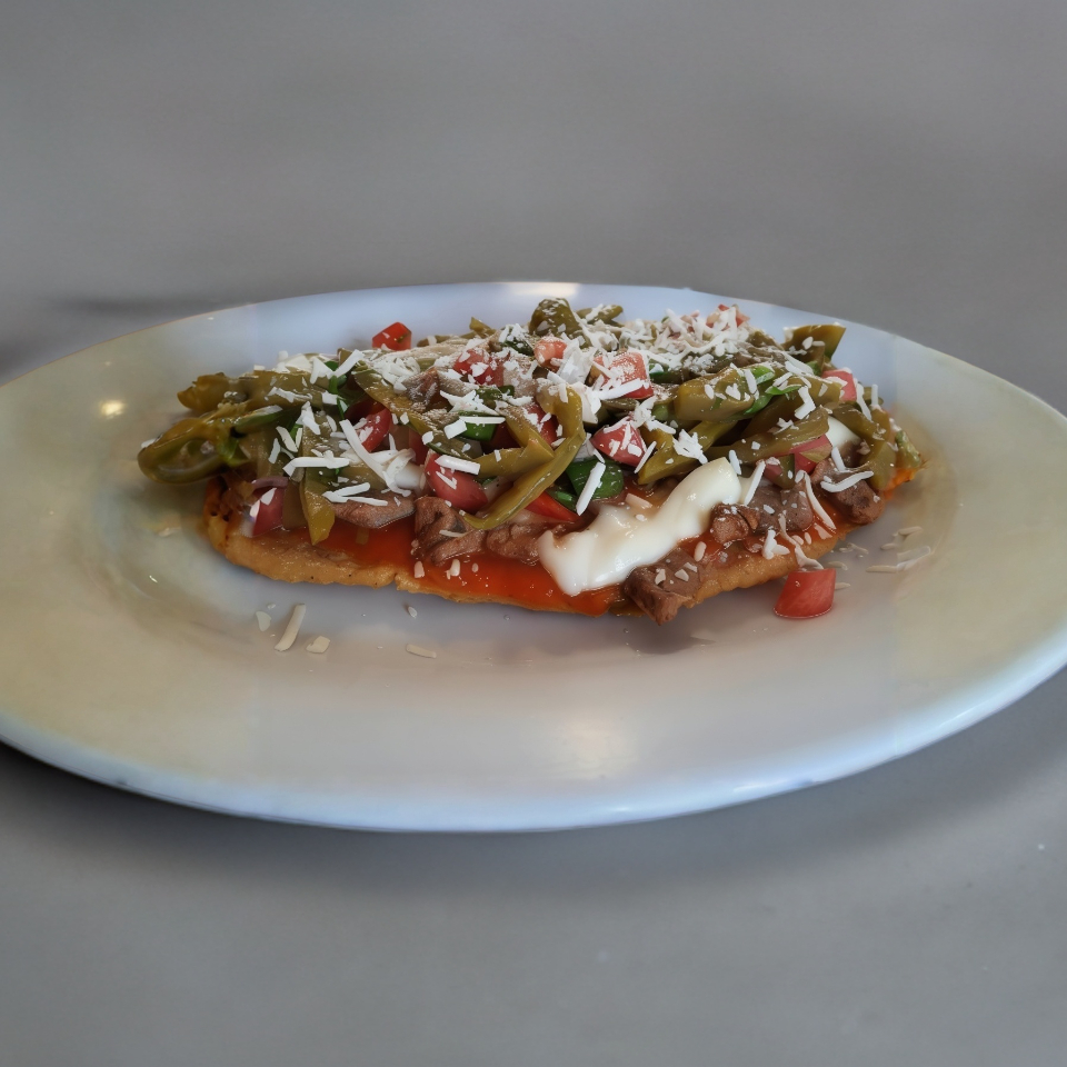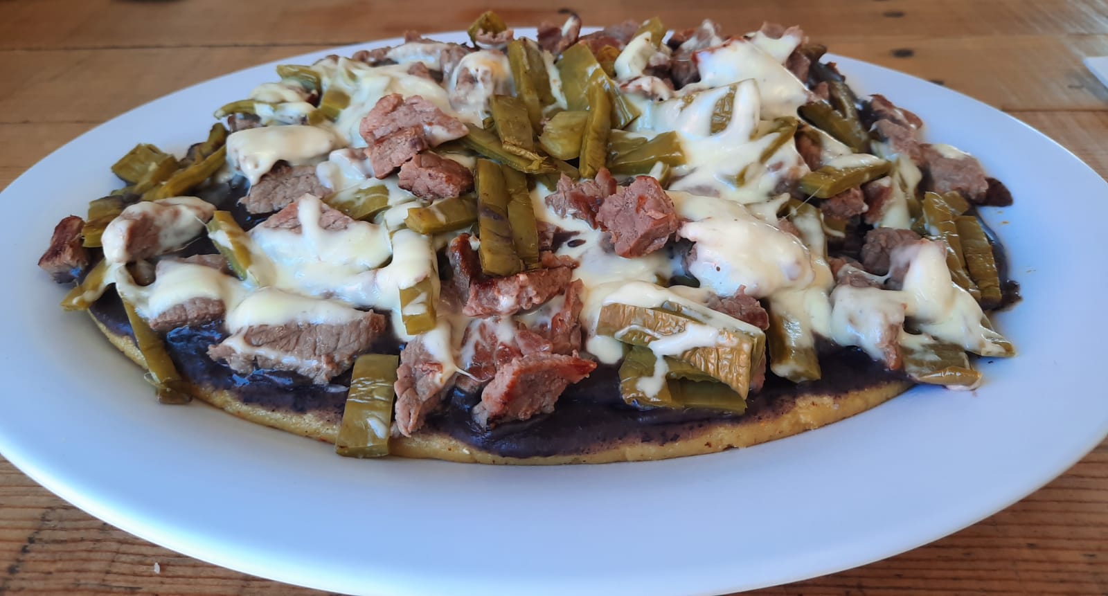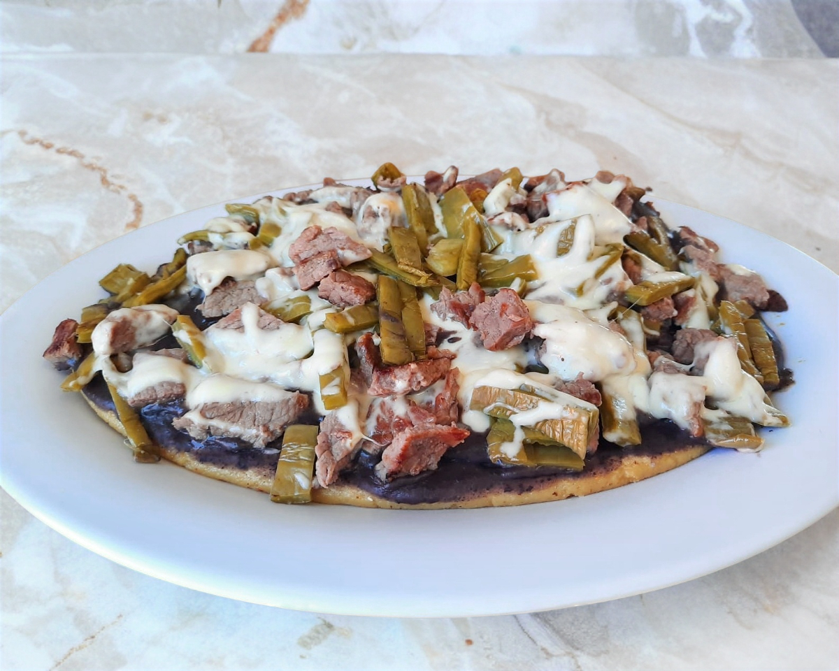 Tortilla ovalada de maíz gruesa servida con frijoles, cebolla, Sirloin, asado con quesillo