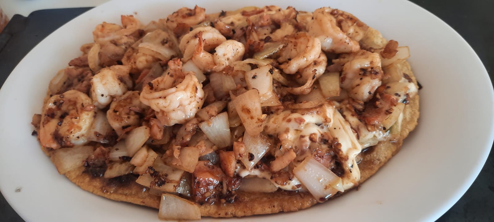 Camarones al ajillo con tocino, cebolla y queso manchego.