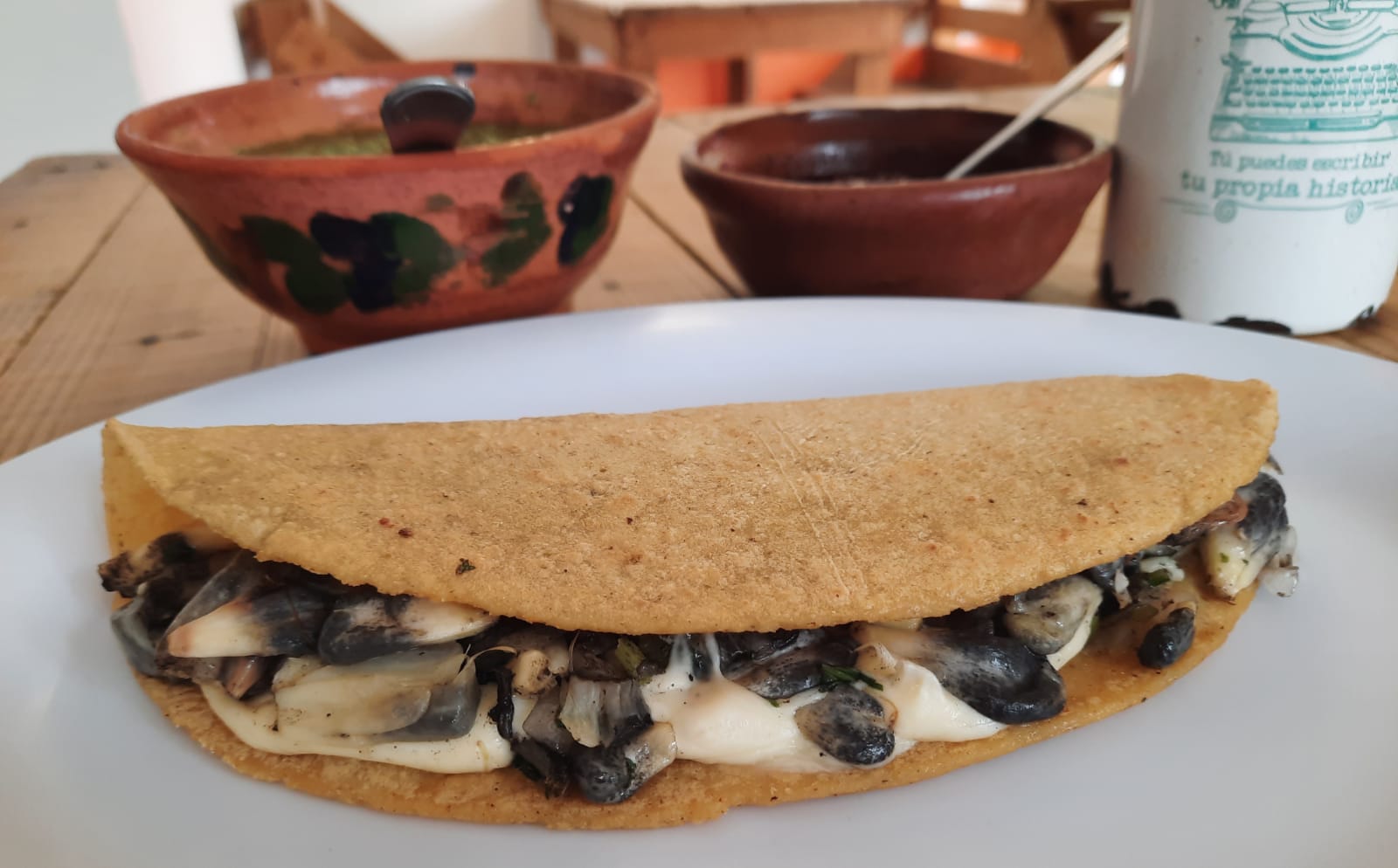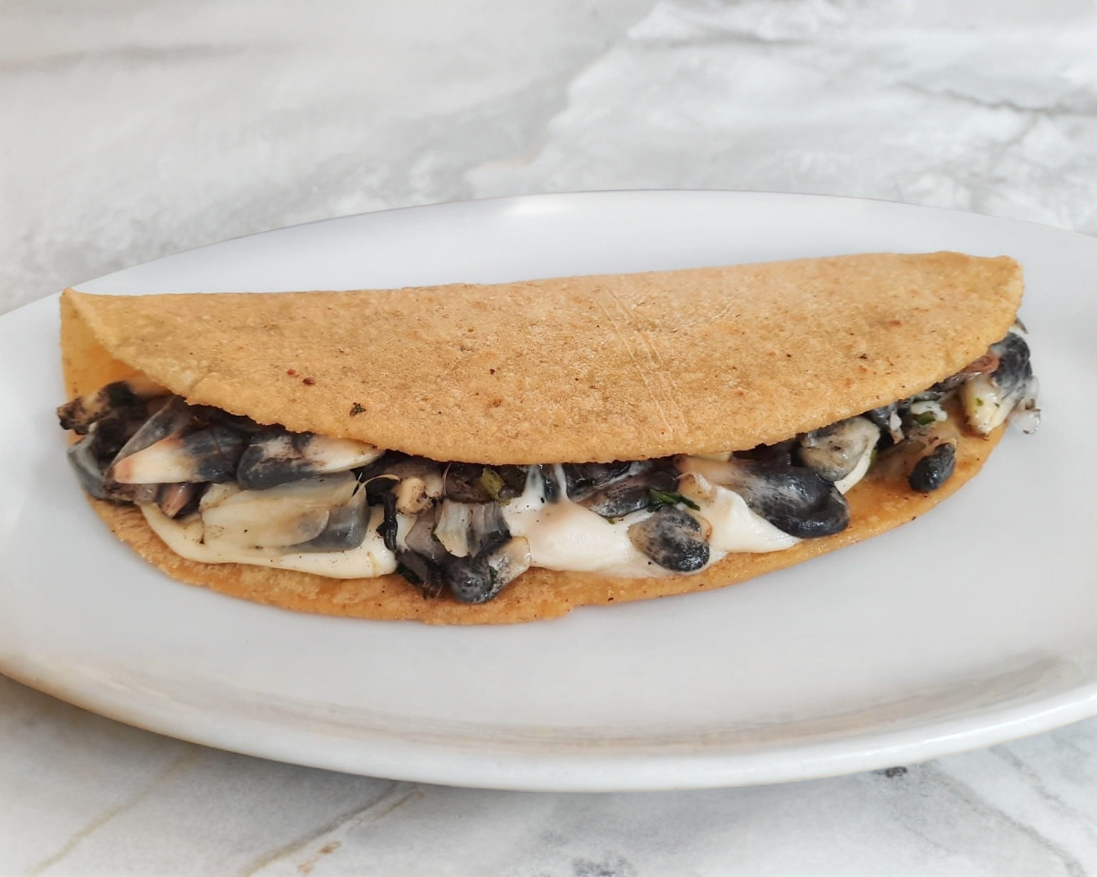 3 piezas, champiñones, espinacas y queso. servido con chilaquiles y frijoles.