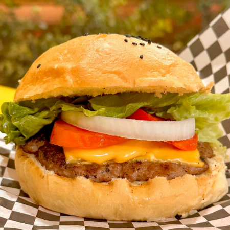 Carne 160 gr, queso amarillo, queso chihuahua, mayonesa, catsup, verdura (cebolla, lechuga, tomate), acompañadas de papas a la francesa (60 gr).