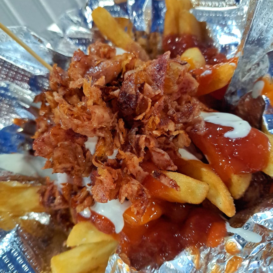 Papas, salsa búfalo, mayonesa, catsup, ranch y coronado con tocino frito.