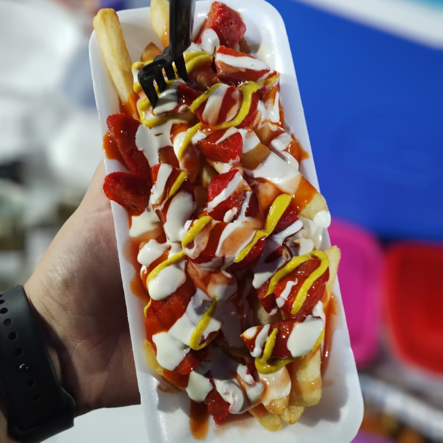 Papas, ranch, salsa búfalo, mayonesa, catsup y salchicha bubba asada.