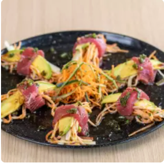 Cubos fritos de atún fresco, bañados con nuestras salsas secretas, montadas en una cama de guacamole y bañados en aderezo maza-go.