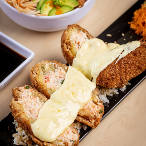 Empanizado, relleno de camarón, philadelphia y aguacate, con Tampico spicy y manchego, bañado en aderezo chipotle.