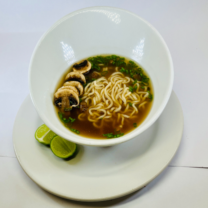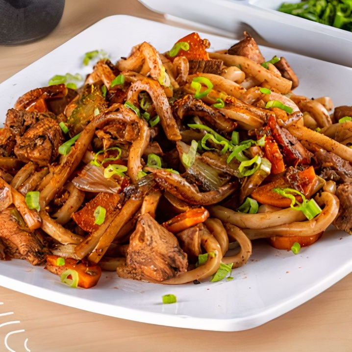 Fideos suaves tradicionales, carne asada, champiñones salteados y cebollín fresco.