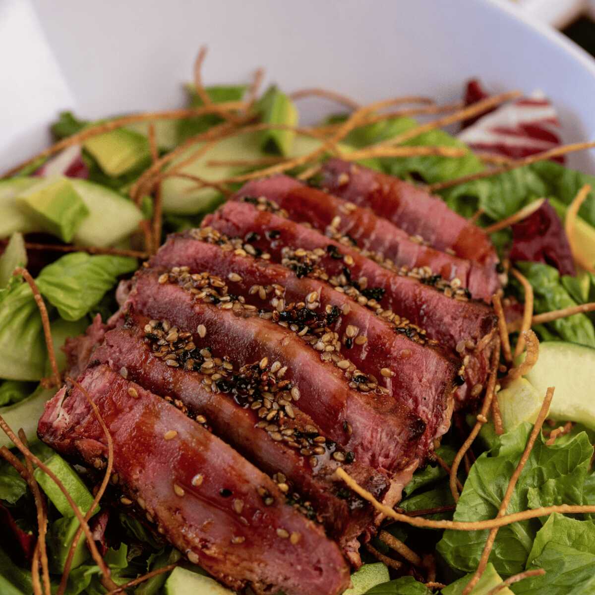 Frescos cubos de atún sellado en ajonjolí en combinación de lechugas, pepino, y aguacate con crujiente de wonton.