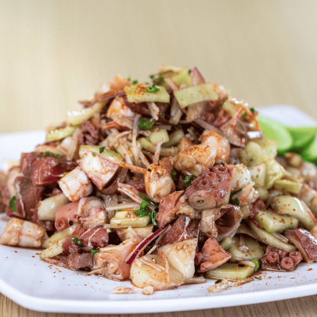 Un mix fresco de camarón cocido, cubos de atún, pulpo, kanikama, pepino y cebolla, todo en salsa oriental con un toque de limón y picante.