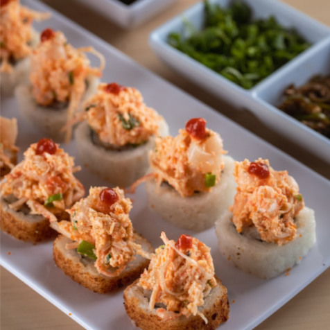 Surimi, philadelphia, aguacate, y cebollín, con gratinado de camarón y un toque de aderezo sriracha.