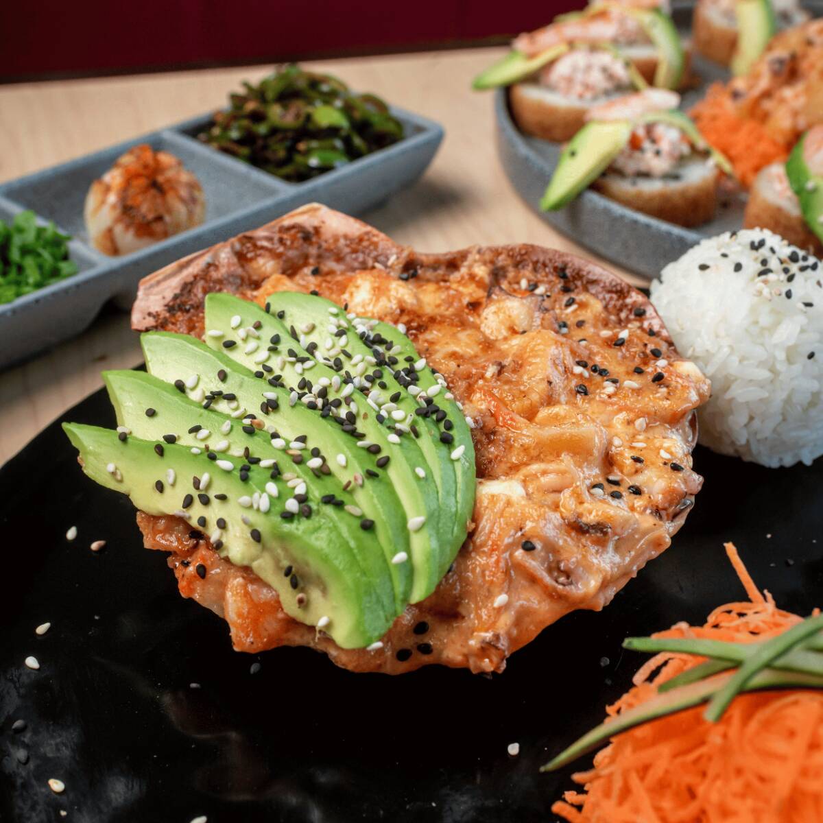 Aguacate, res y philadelphia por dentro, bañado con un gratinado picosito.