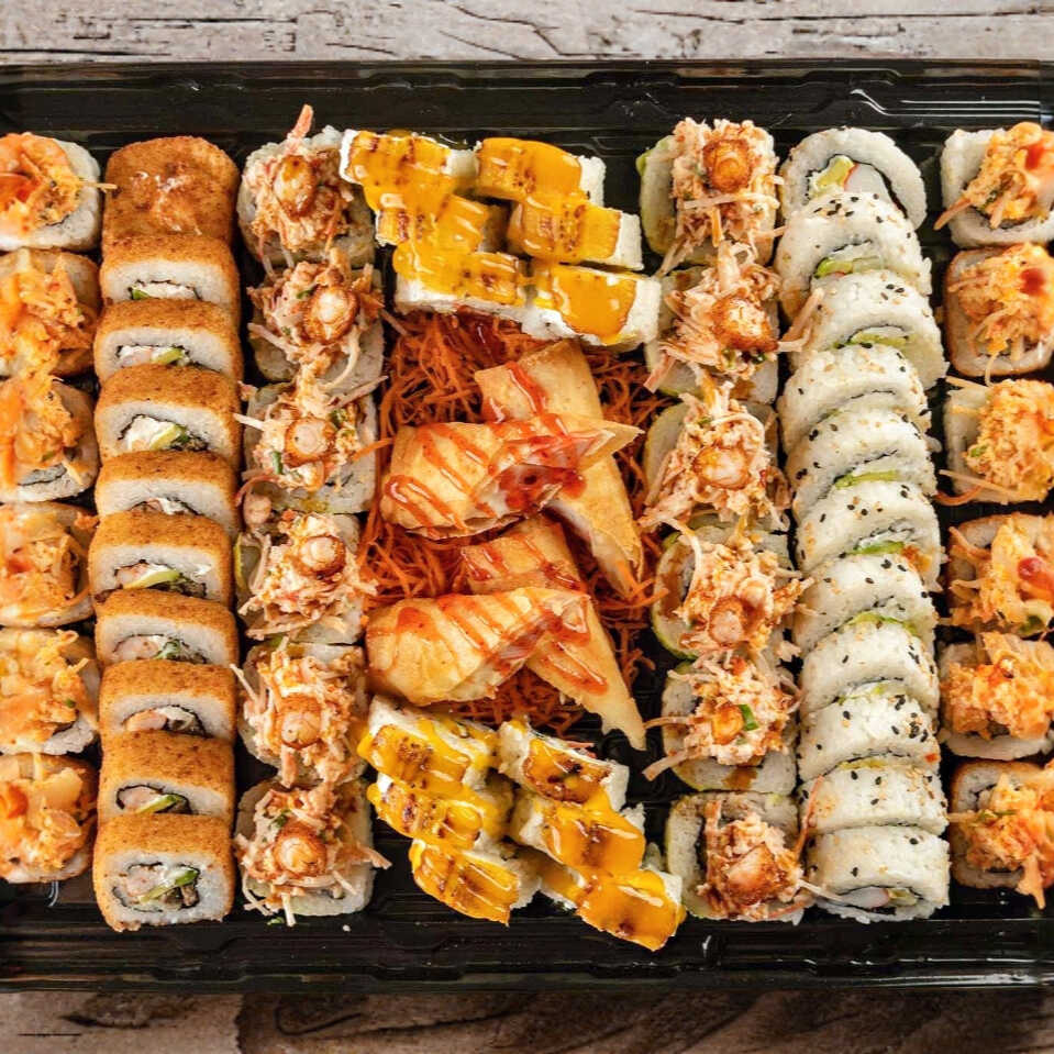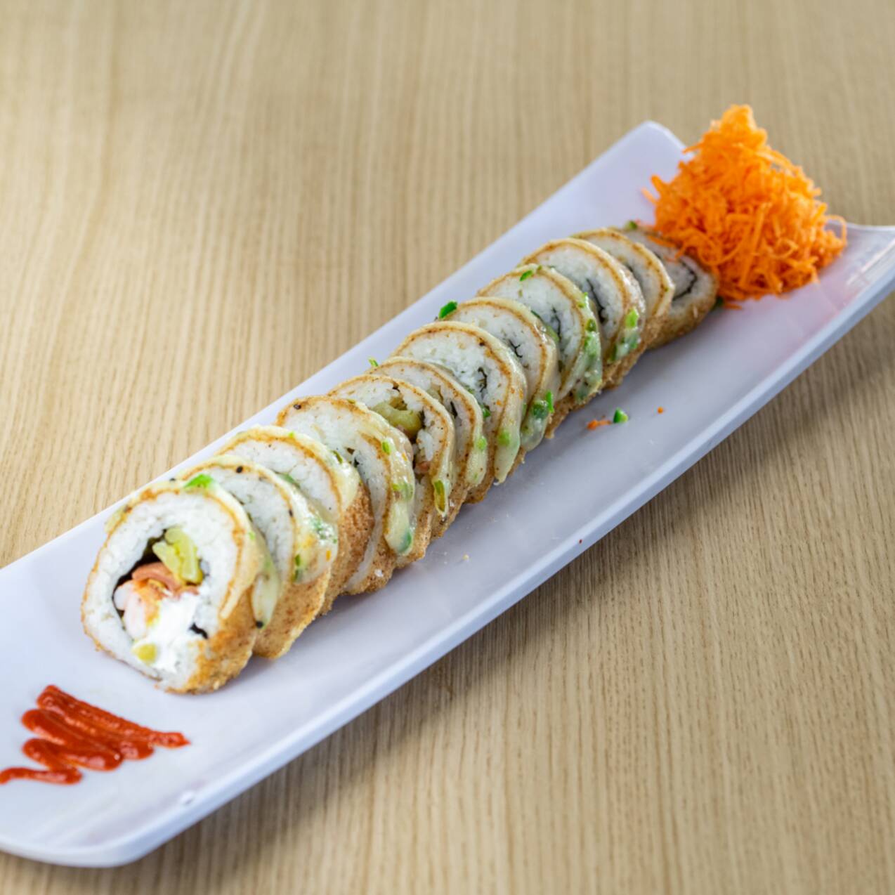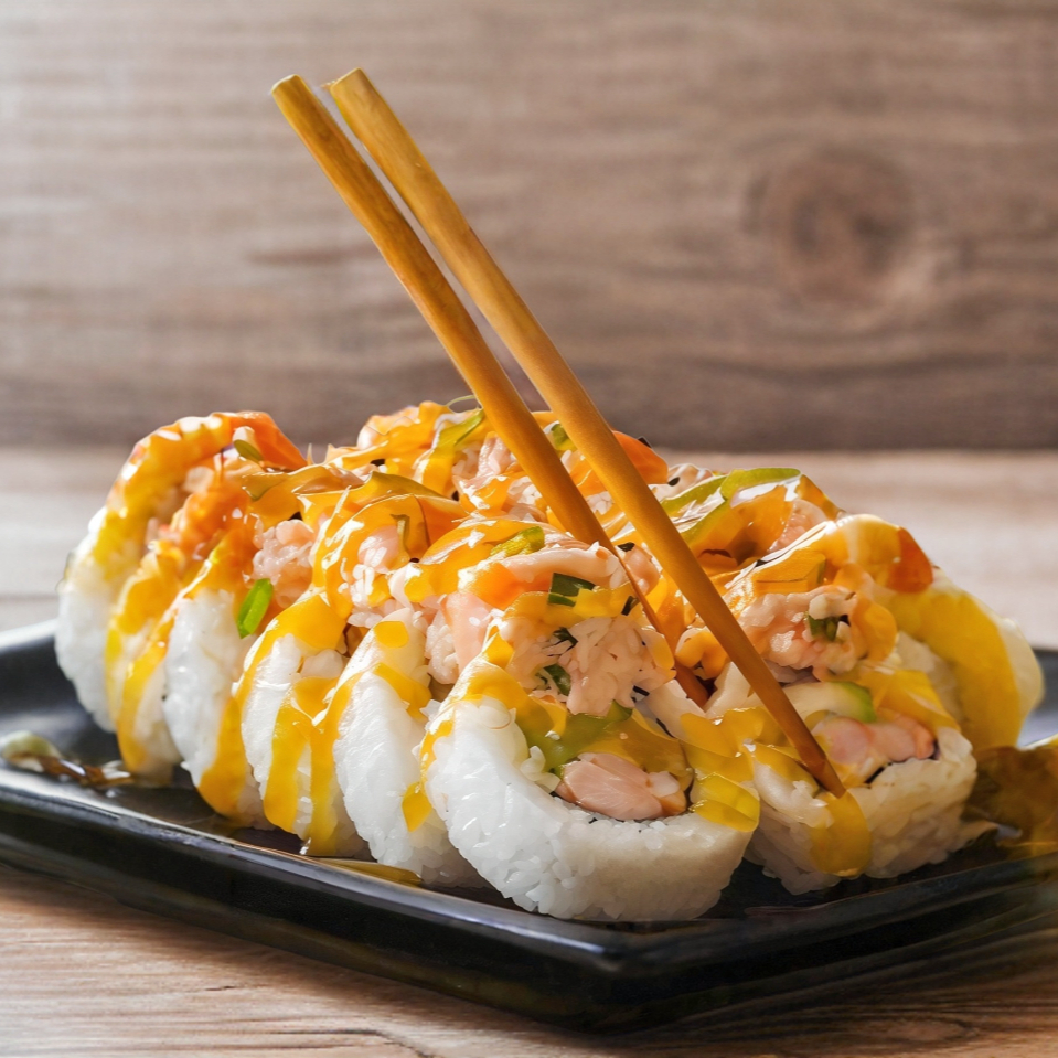 Surimi, philadelphia, aguacate, y cebollín, con gratinado de camarón y un toque de aderezo siracha.