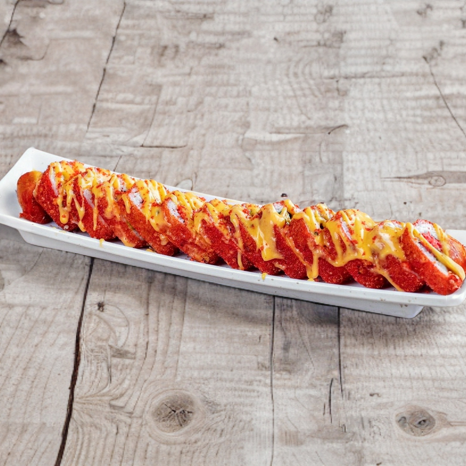 Rollo empanizado con flaminhot. Por dentro res, aguacate y philadelphia cubierto con queso manchego y bañado con aderezo de queso americano.