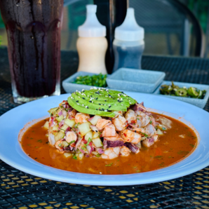 Atún fresco, pulpo, camarón crudo y cocido, pepino fresco y cebolla morada y nuestra inigualable receta de salsa chiquiona.