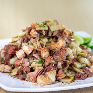Un mix fresco de camarón cocido, cubos de atún, pulpo, kanikama, pepino y cebolla, todo en salsa oriental con un toque de limón y picante.