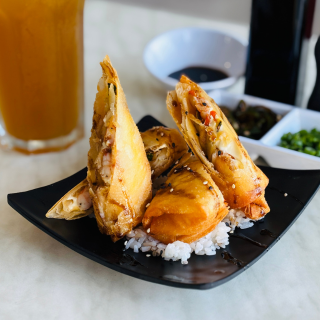 Empanizado relleno de camarón, philadelphia y aguacate, con tampico spicy y manchego, bañado en aderezo chipotle.