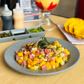 Atún fresco con fruta de temporada, pepino y cebolla morada, más chilito en polvo y nuestra tradicional salsa negra.