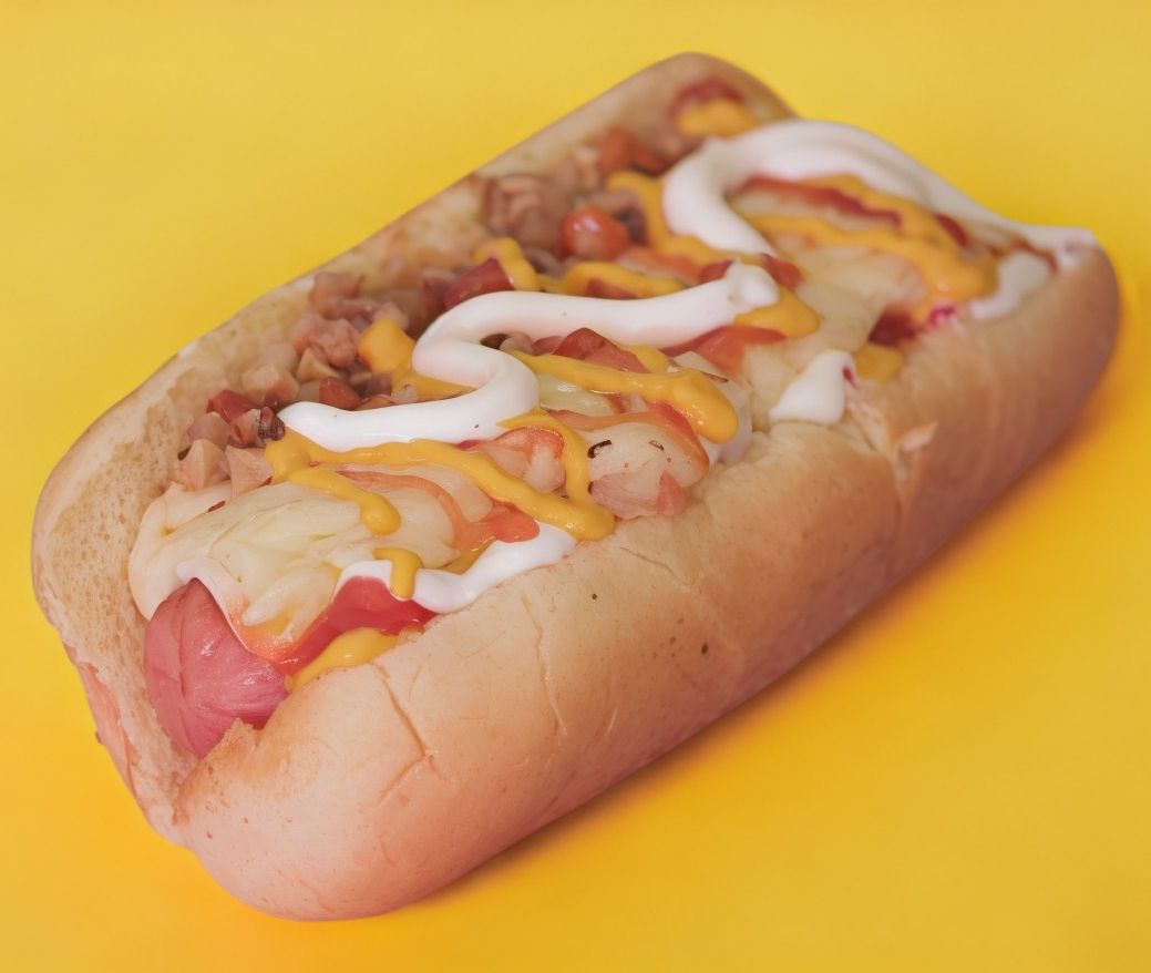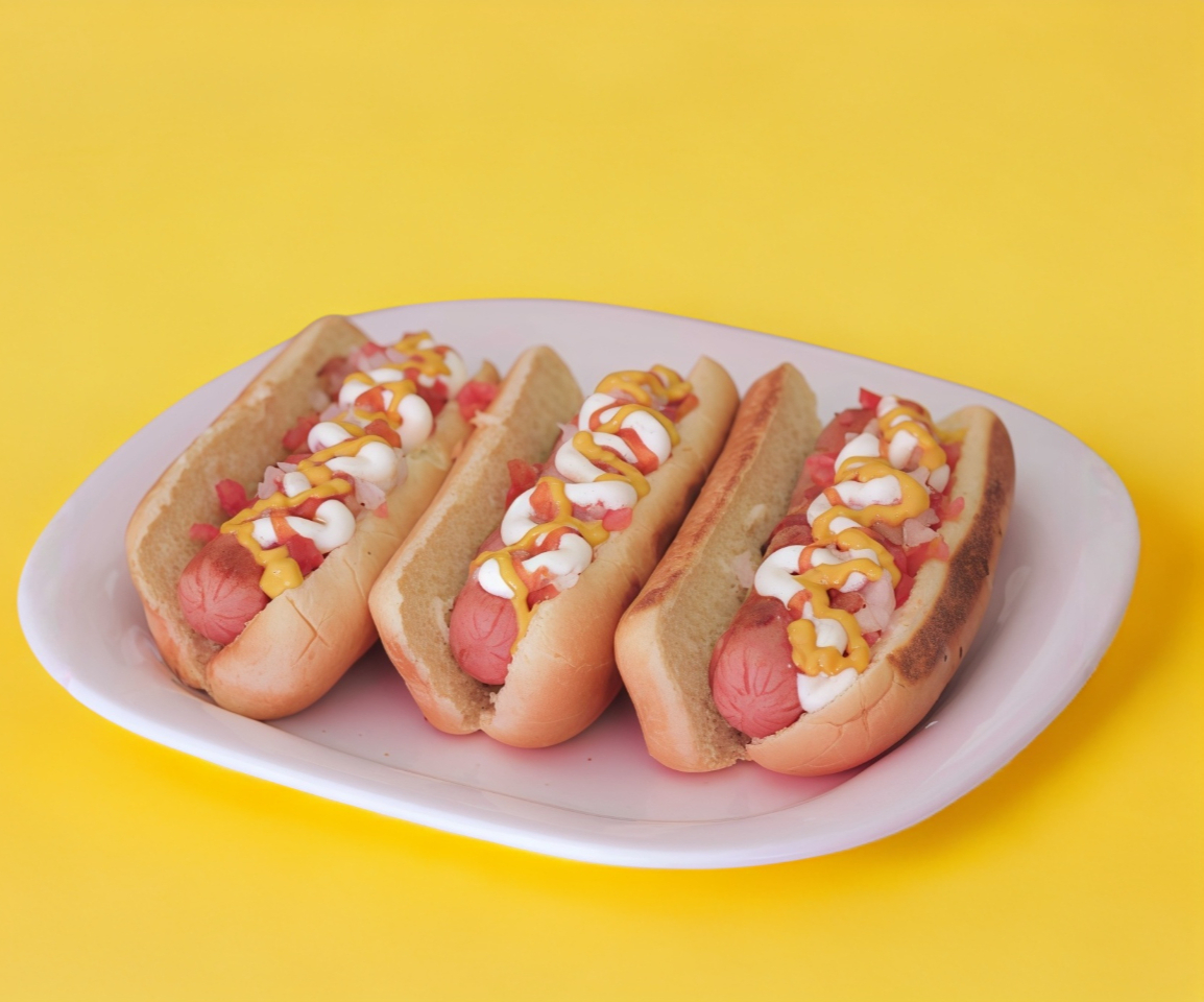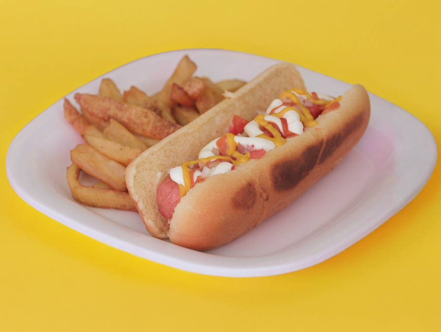 Salchicha con tocino, carne especial de pierna, crema, cátsup, mostaza, tomate, cebolla y pan tradicional
