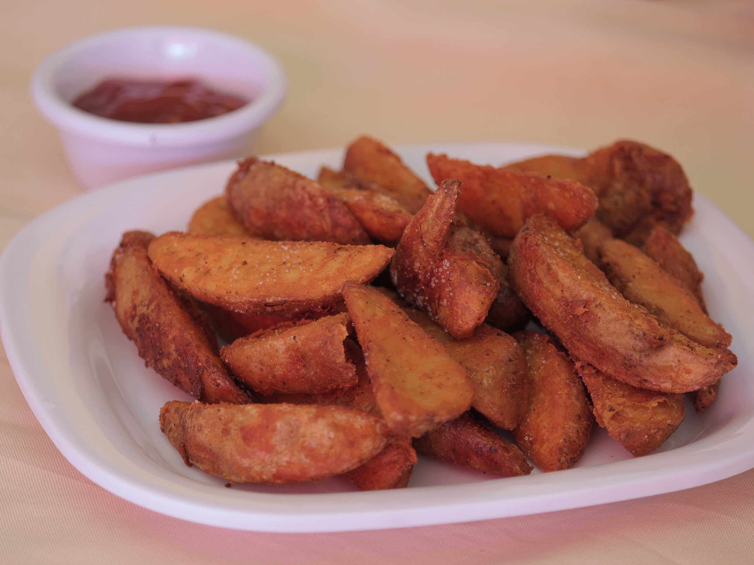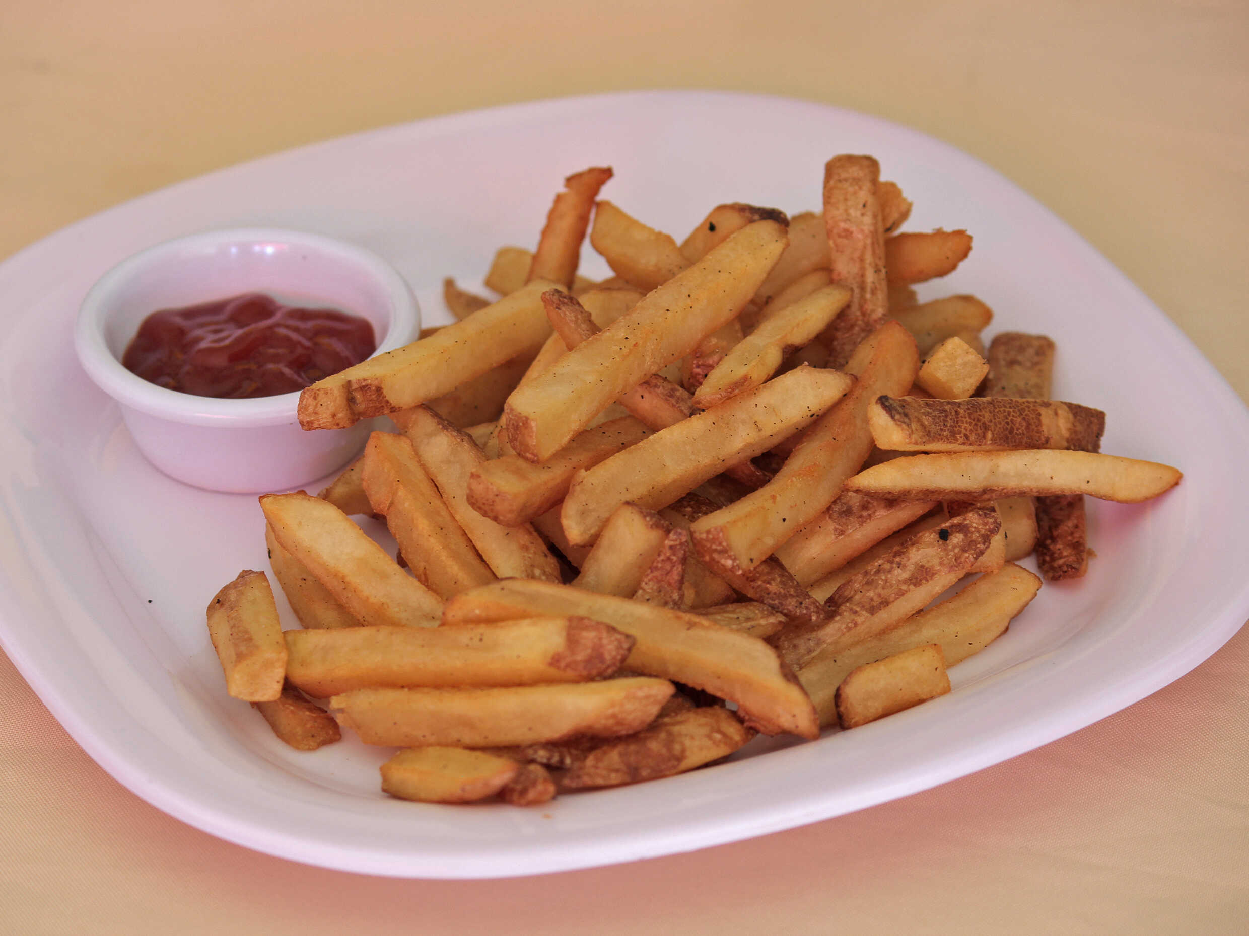 Salchicha fritas en rodaja, papás a la francesa, queso amarillo y crema.