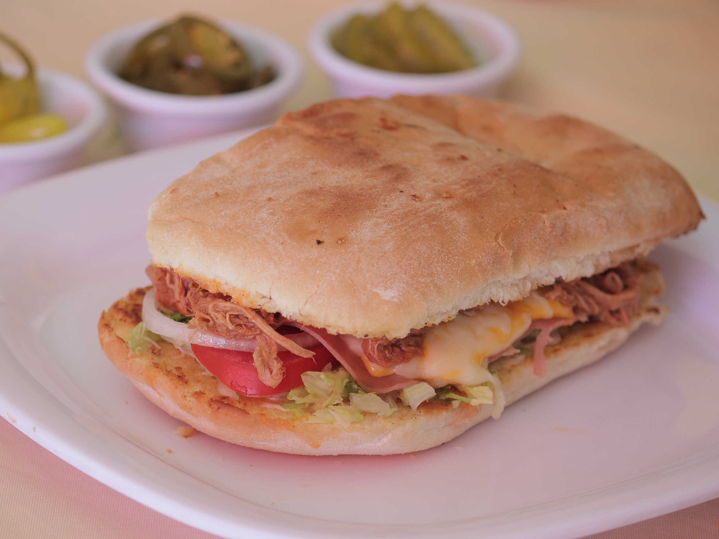 Carne especial de pierna, jamón, queso americano, queso chihuhua, piña en almíbar, mayonesa, queso amarillo, tomate, cebolla, lechuga, crema y telera artesanal.