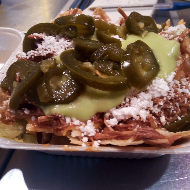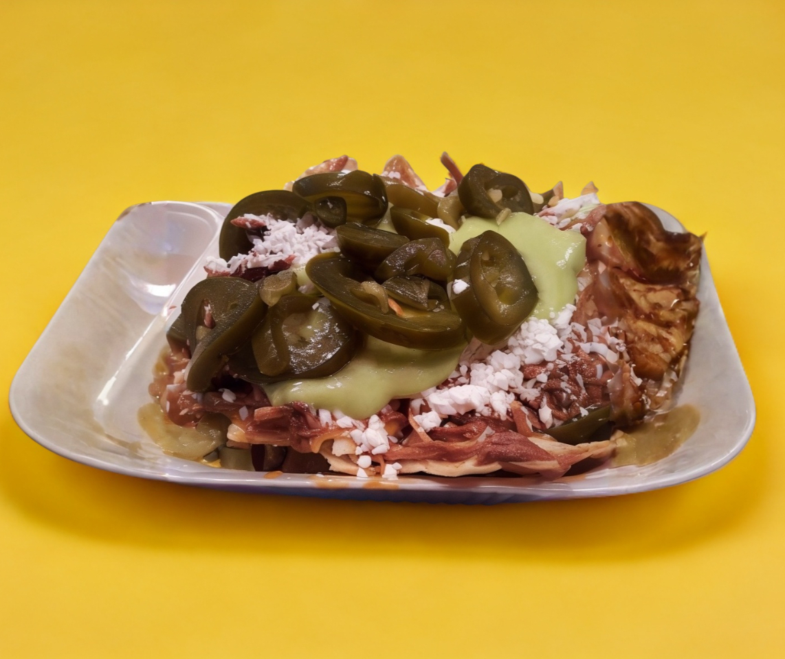 Papas a la francesa, carne especial de pierna, frijol, queso cotija y queso amarillo.