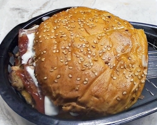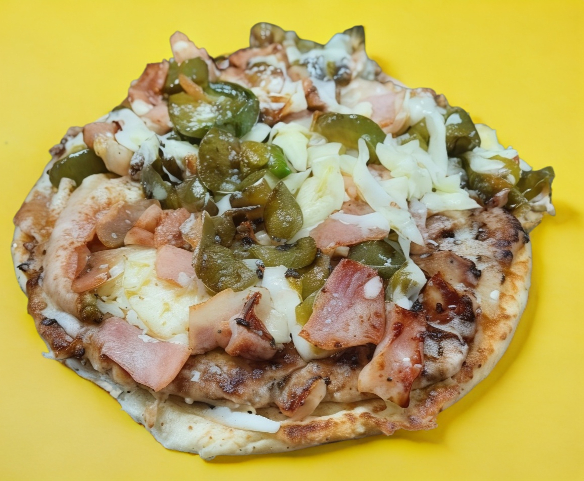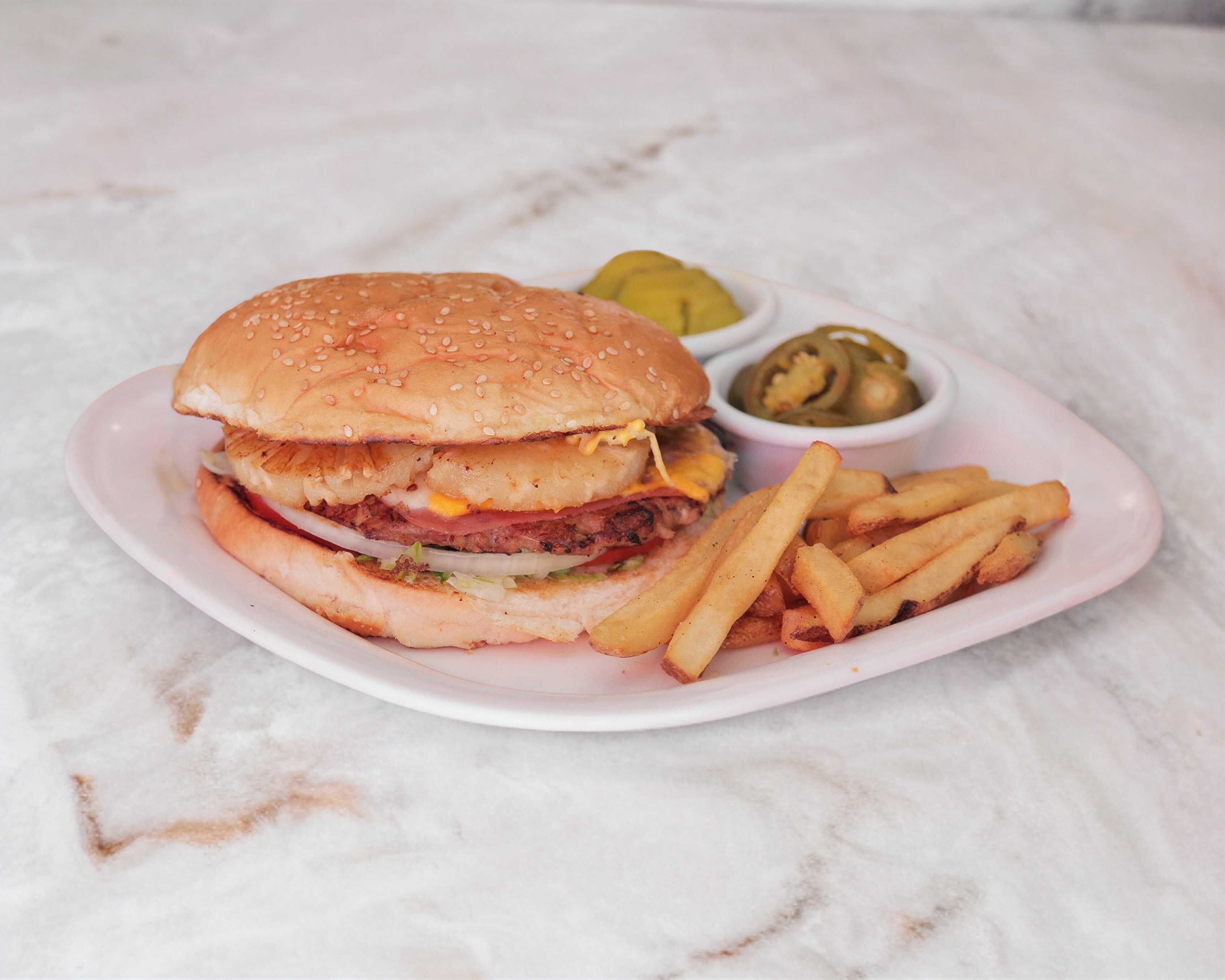 Carne de sirloin, piña en almíbar, queso americano, jamón, queso Chihuahua, mayonesa, tomate, cebolla, lechuga crema, cátsup, pan artesanal.
