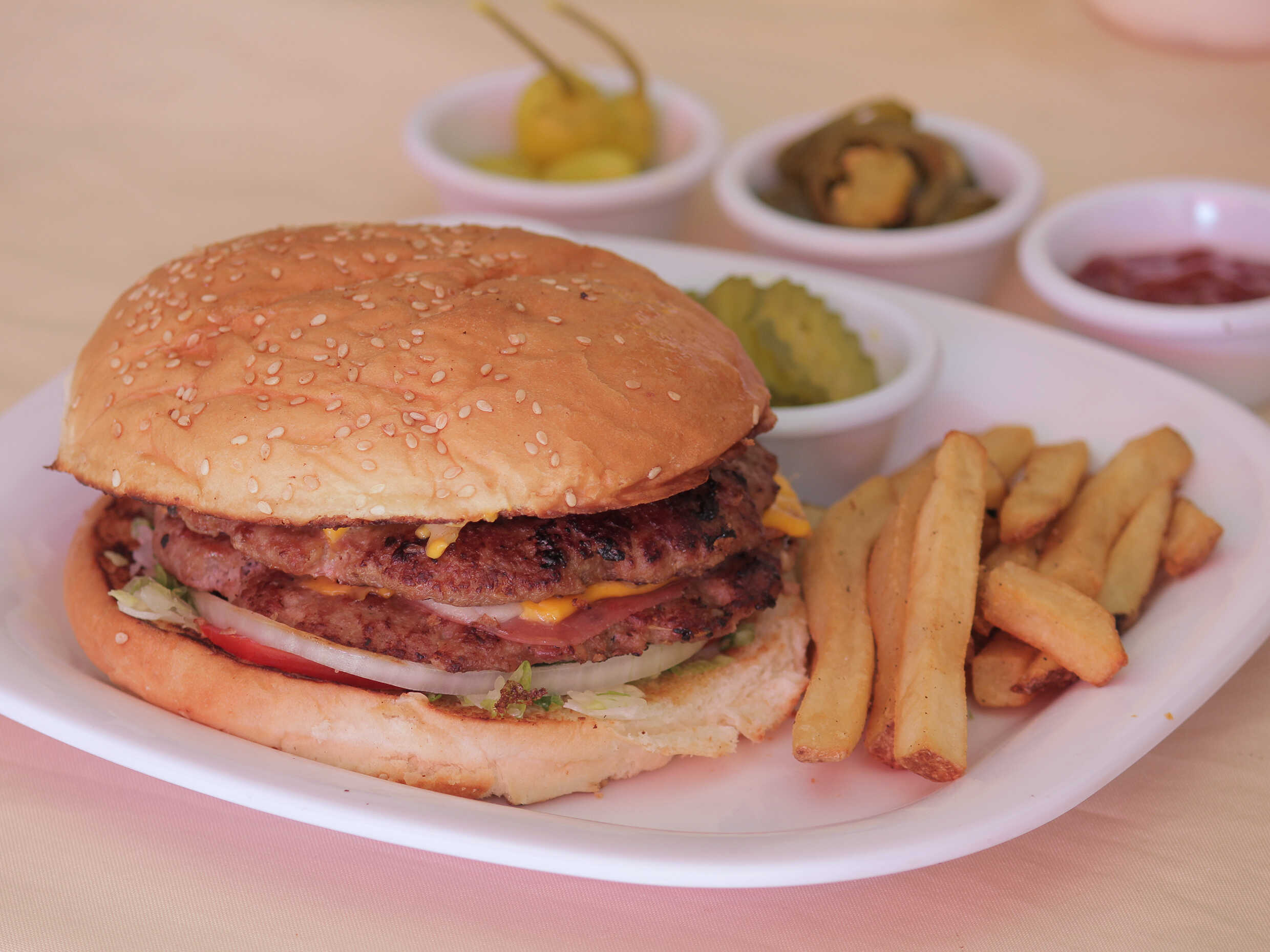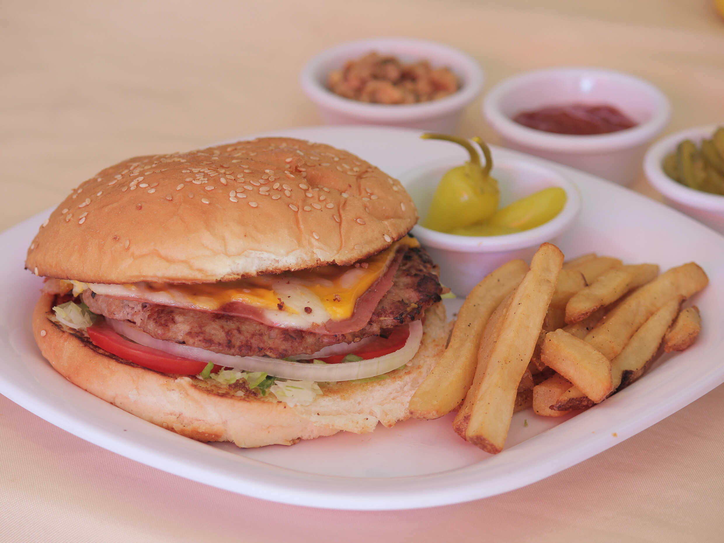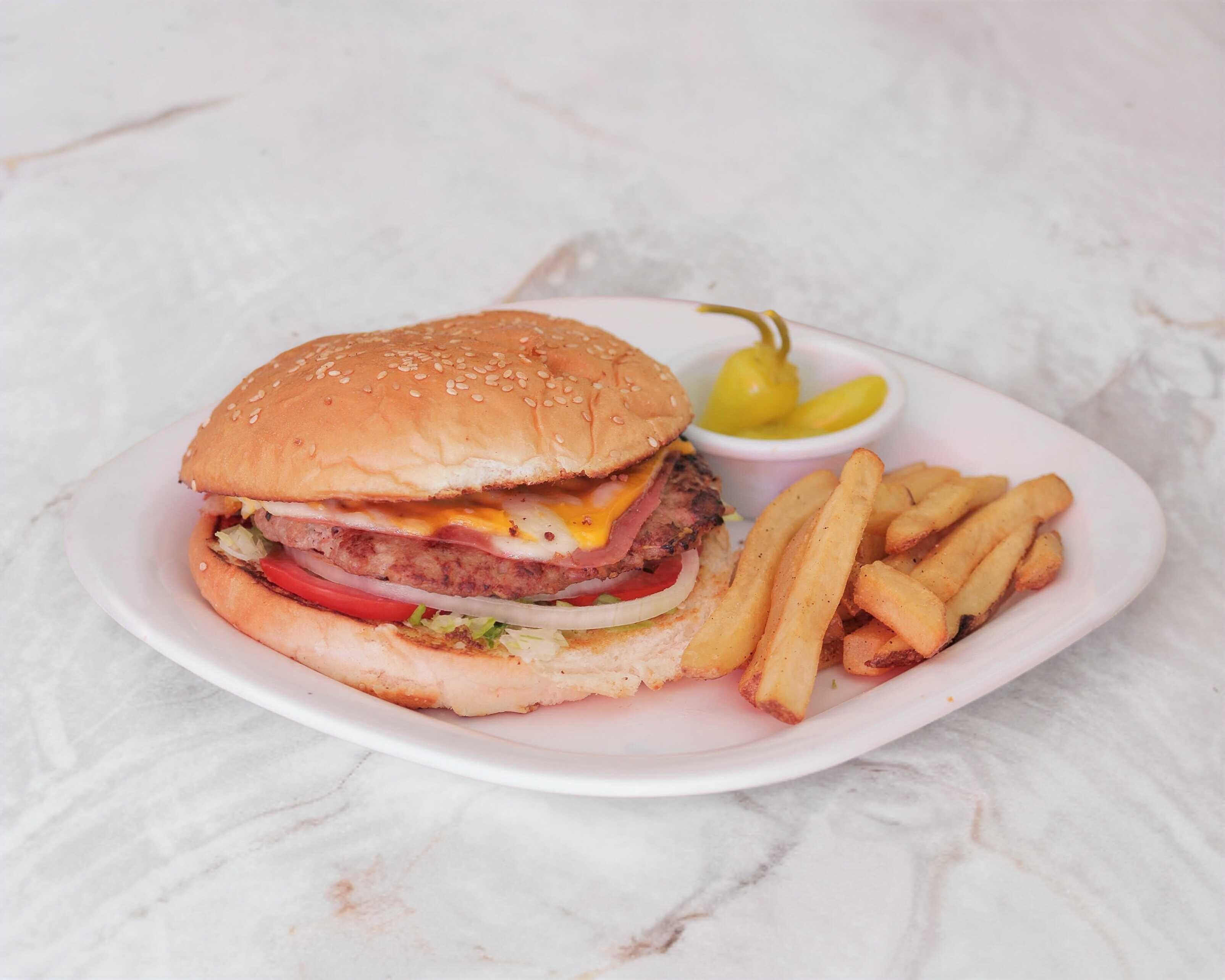 Carne de sirloin, queso americano, mayonesa, tomate, cebolla, lechuga, crema, cátsup y pan artesanal.