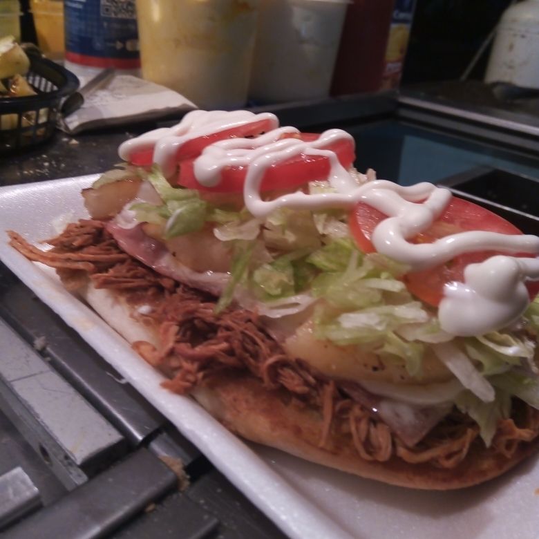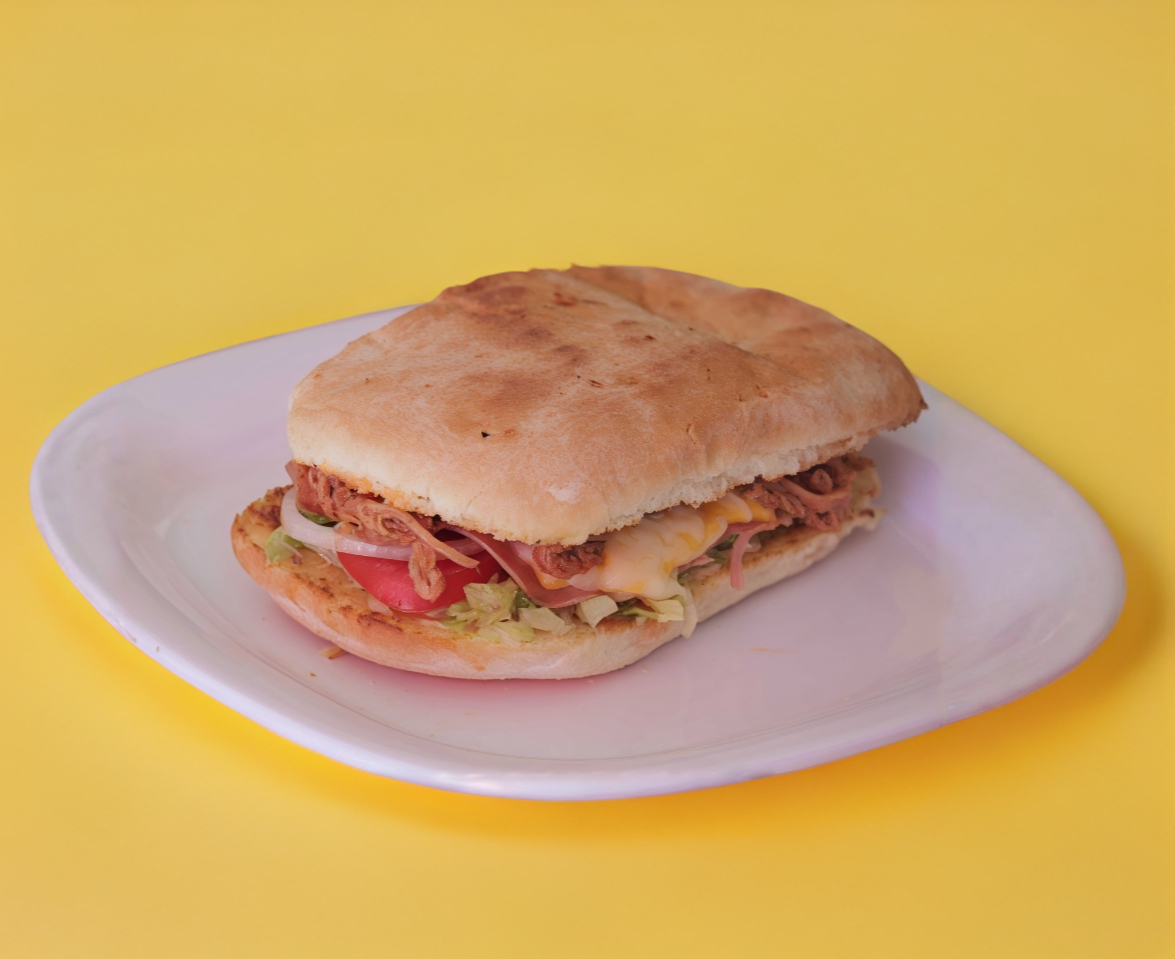 Carne especial de pierna, jamón, queso americano, queso chihuhua, mayonesa, queso amarillo, tomate, cebolla, lechuga, crema y telera artesanal.
