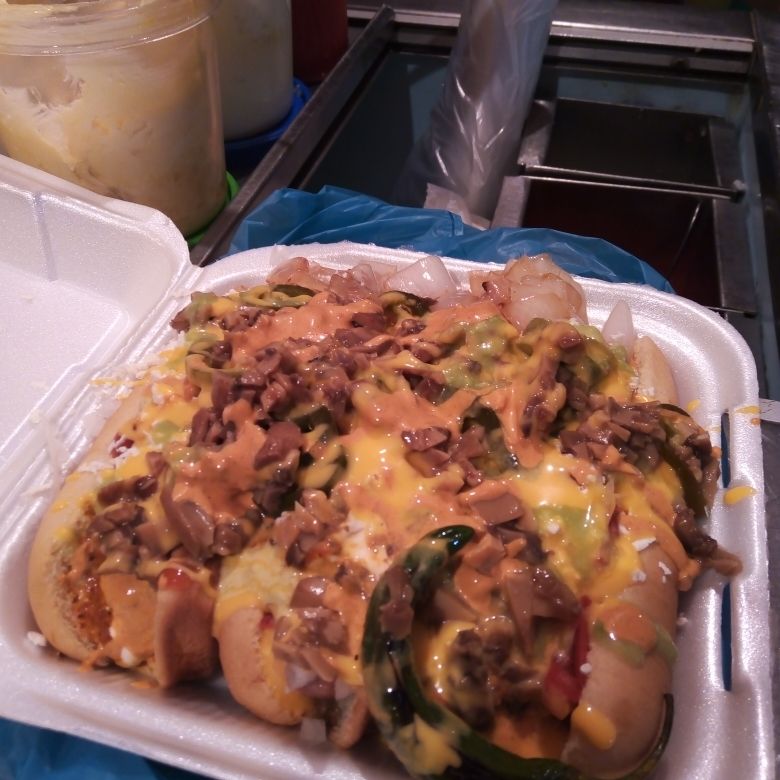 Salchicha con tocino, queso Chihuahua, tomate cebolla crema cátsup, mostaza y pan artesanal.