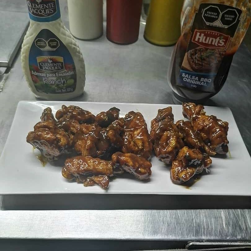 8Piezas de alitas de pollo sazonadas, bañadas en salsa bbq acompañadas de aderezo ranch