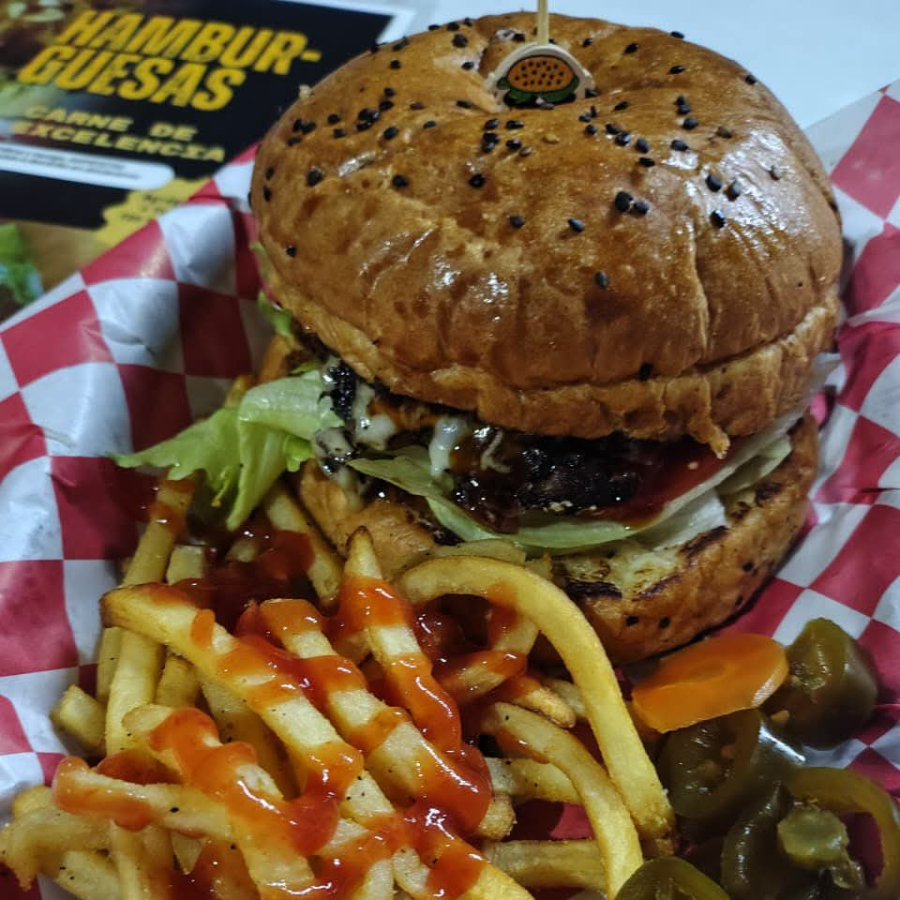Carne 100% de res, queso manchego, tocino, aguacate, verduras, aderezos, incluye papas.