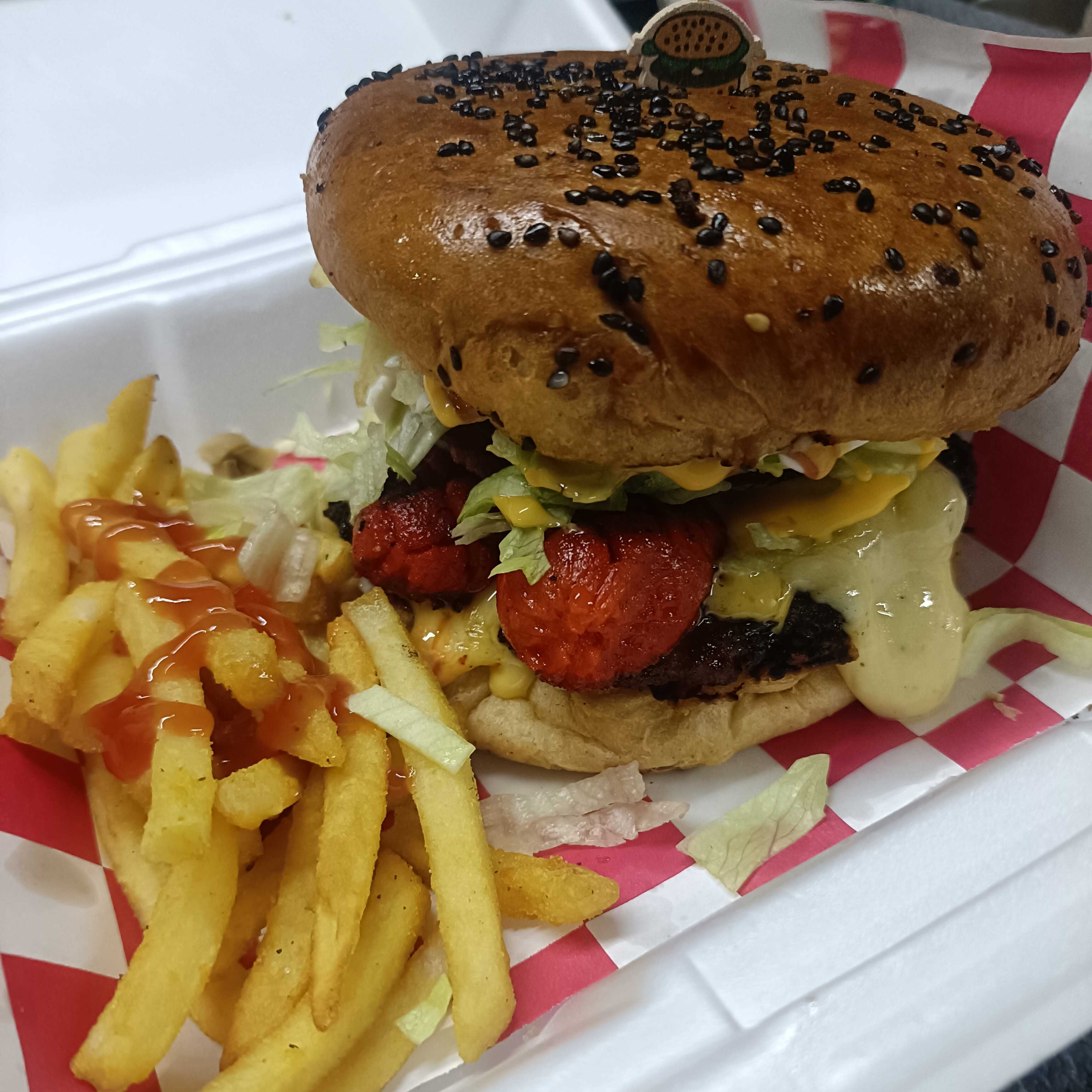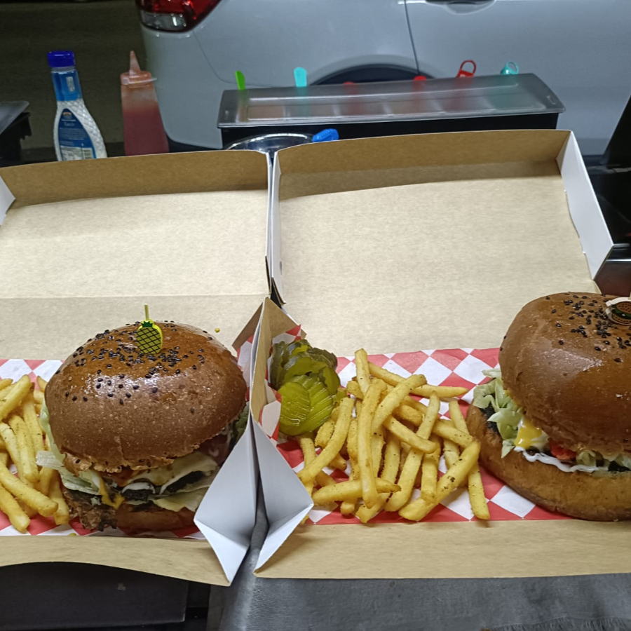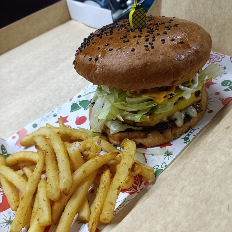 carne 100% de res, queso manchego, piña, teriyaky,verdura y aderezos. inlcuye papas.