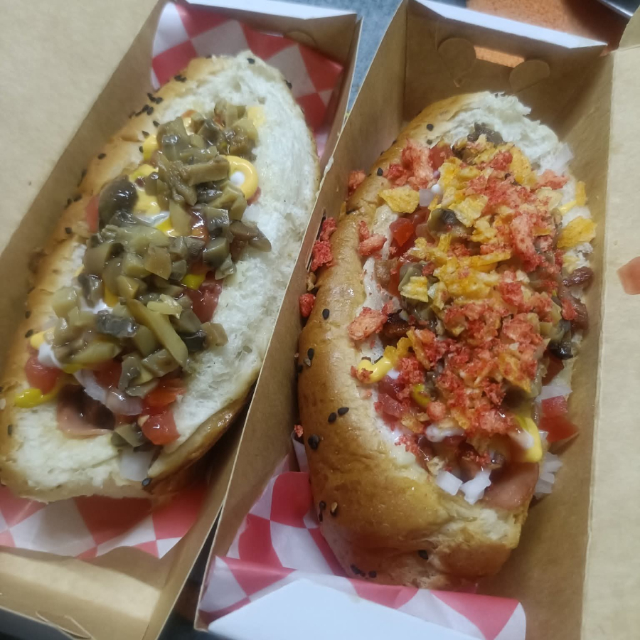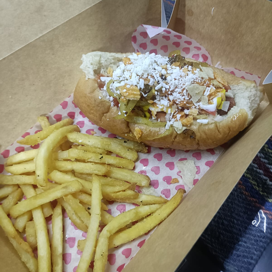 Salchicha de pavo, verdura y aderezos , pan artesanal. incluye papas.