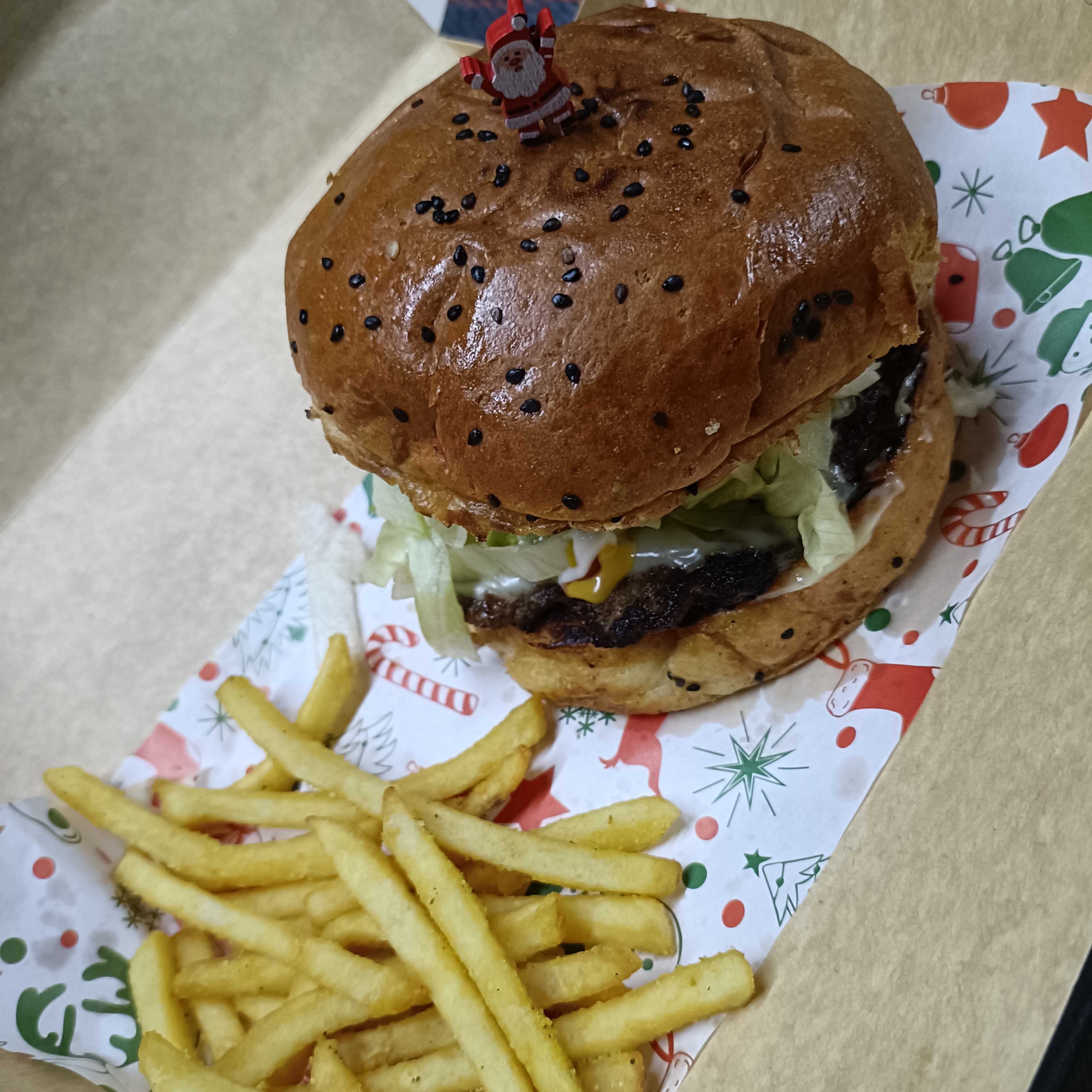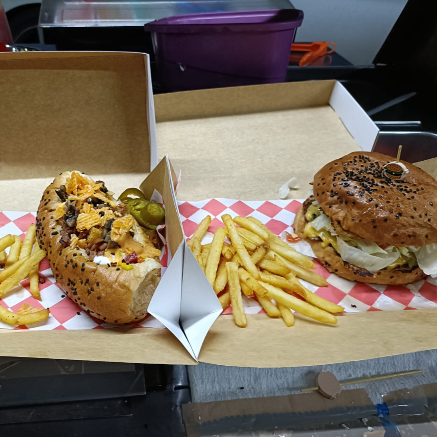 Carne 100% de res, queso amarillo, verduras y aderezos, incluye papas
