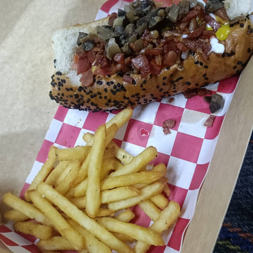 Doble salchica de pavo envuelta en tocino,trozos de salchicha roja,pan jumbo,verduras y aderezos. incluye papas.
