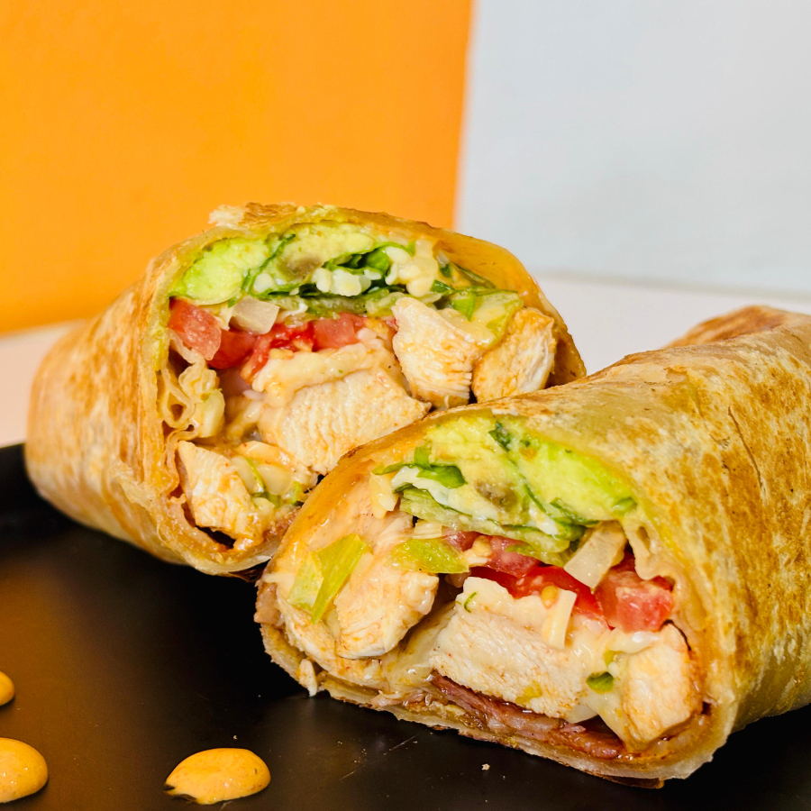 TORTILLA DE HARINA, POLLO, QUESO GRATINADO, ADEREZO ESPECIAL DE LA CASA BASE DE CHIPOTLE, LECHUGA, TOMATE, CEBOLLA, AGUACATE,