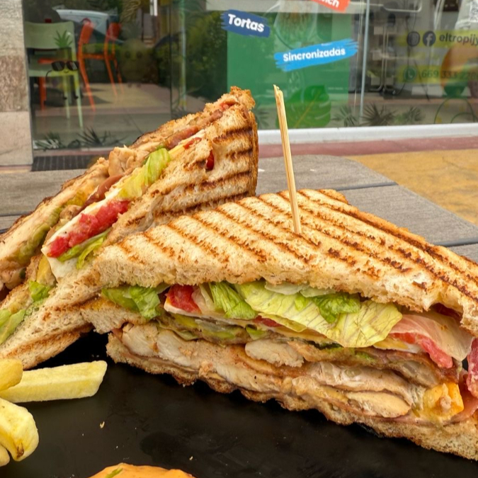 SANDWICH 3 PISOS, POLLOM, JAMON, QUESO GRATINADO, LECHUGA, TOMATE, CEBOLLA, AGUACATE, MAYONESA, CREMA