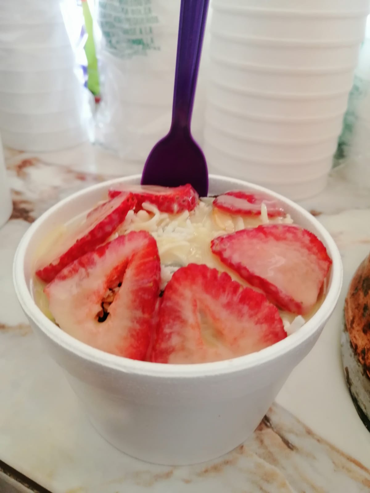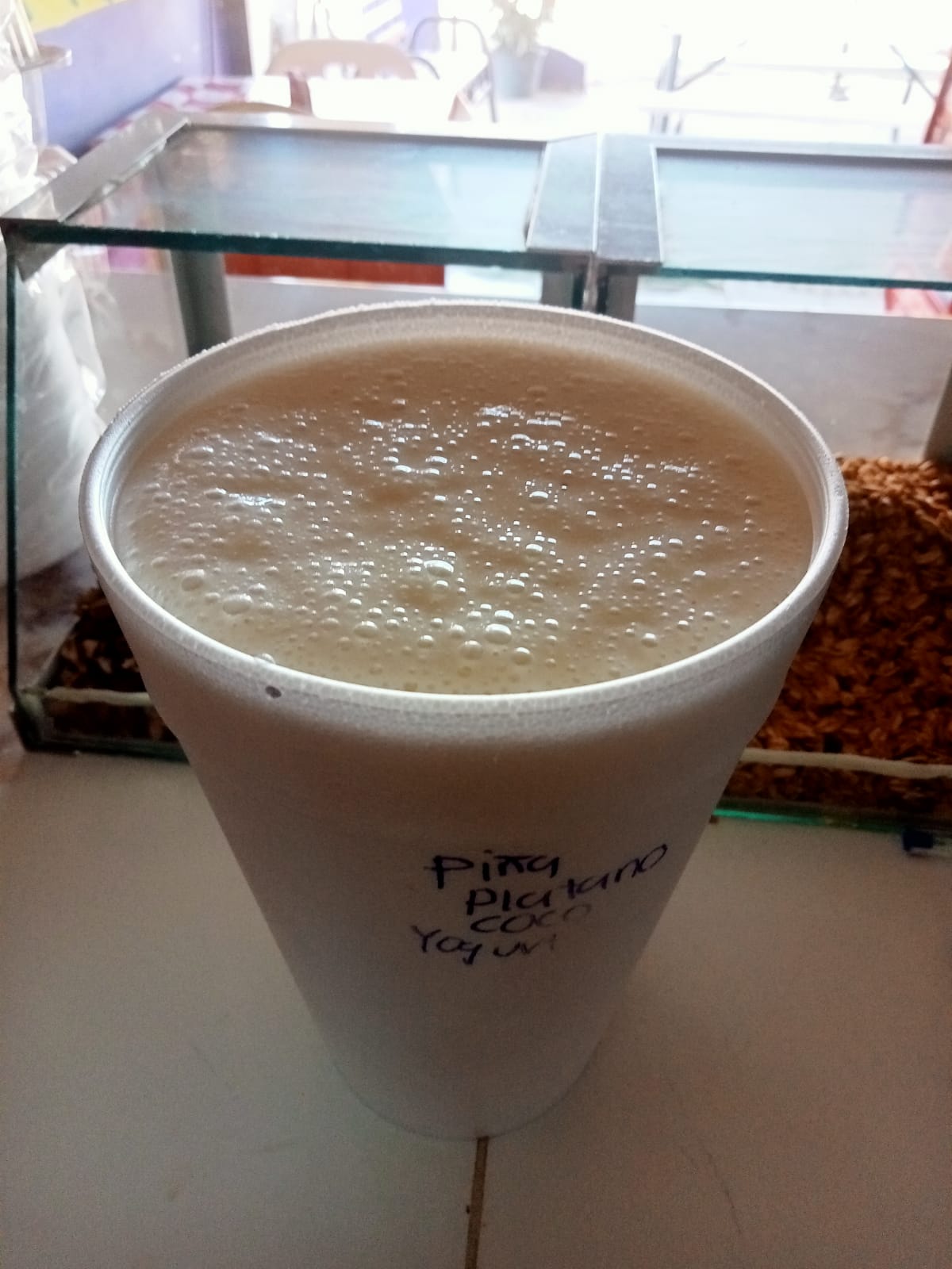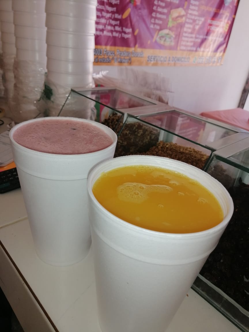Papaya,melón,plátano,manzana verde,manzana roja,fresa. En una:cereales:coco,granola pasas,nuez y lecherita