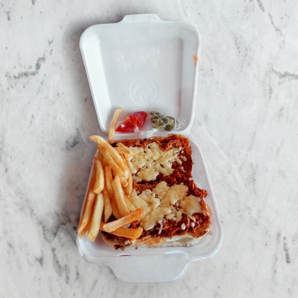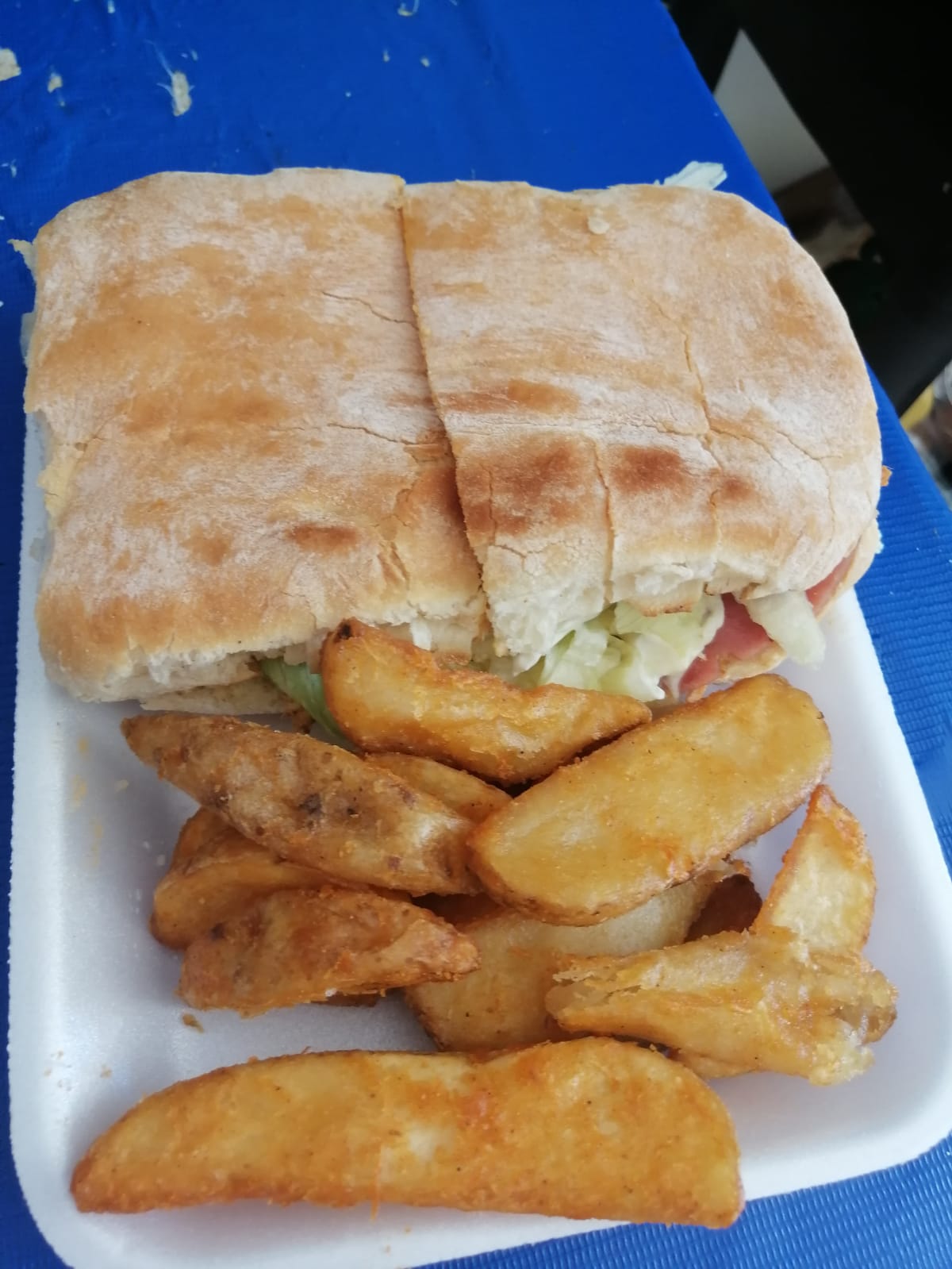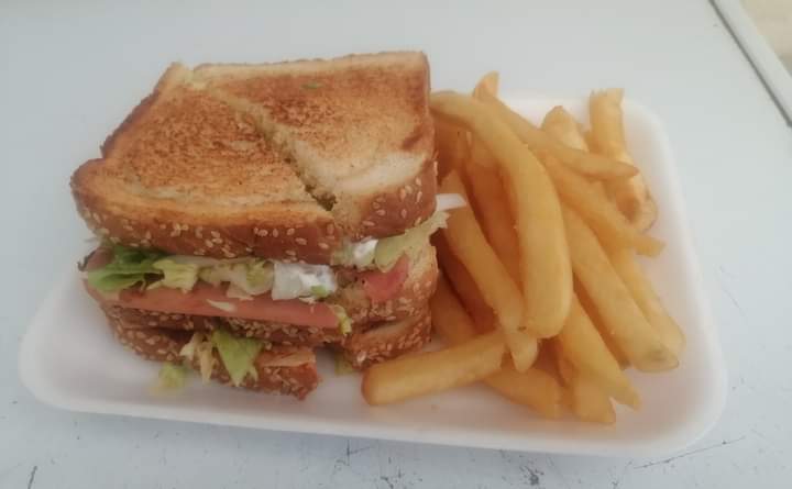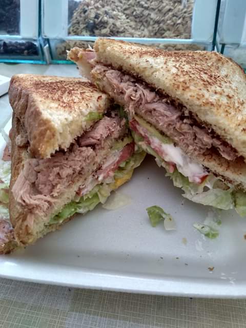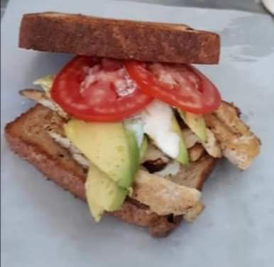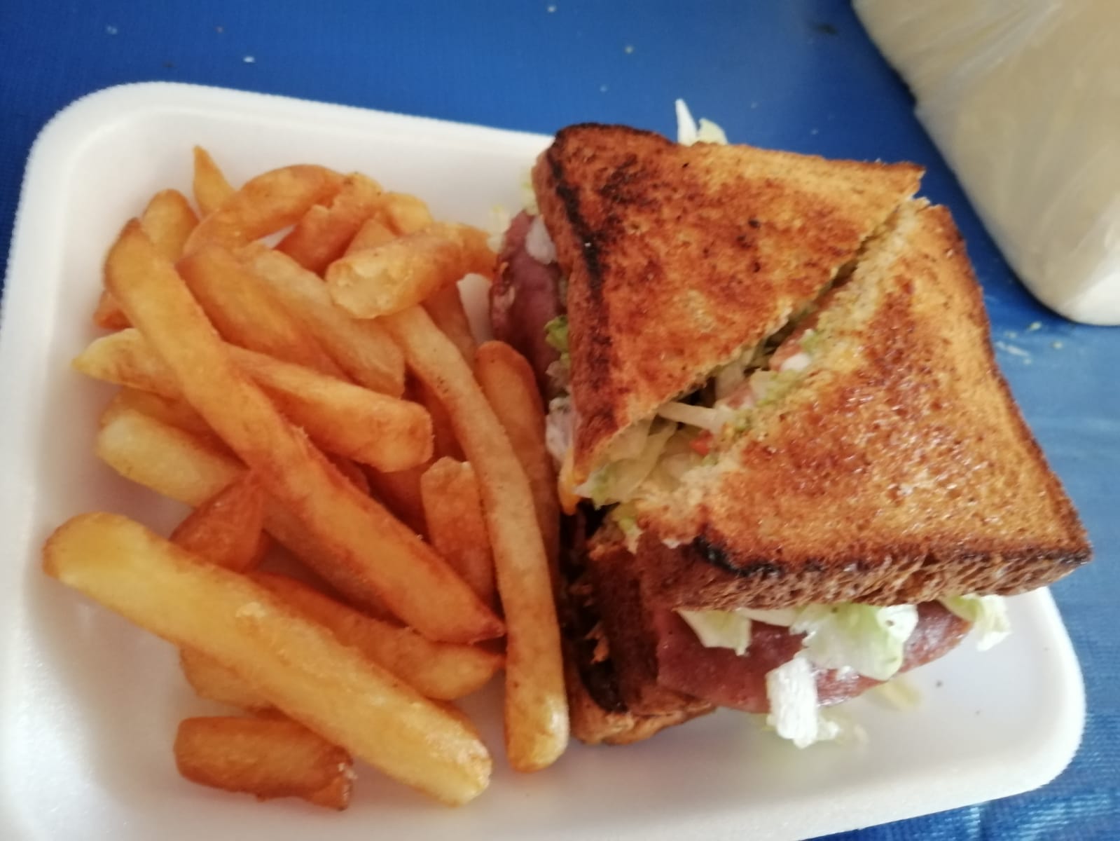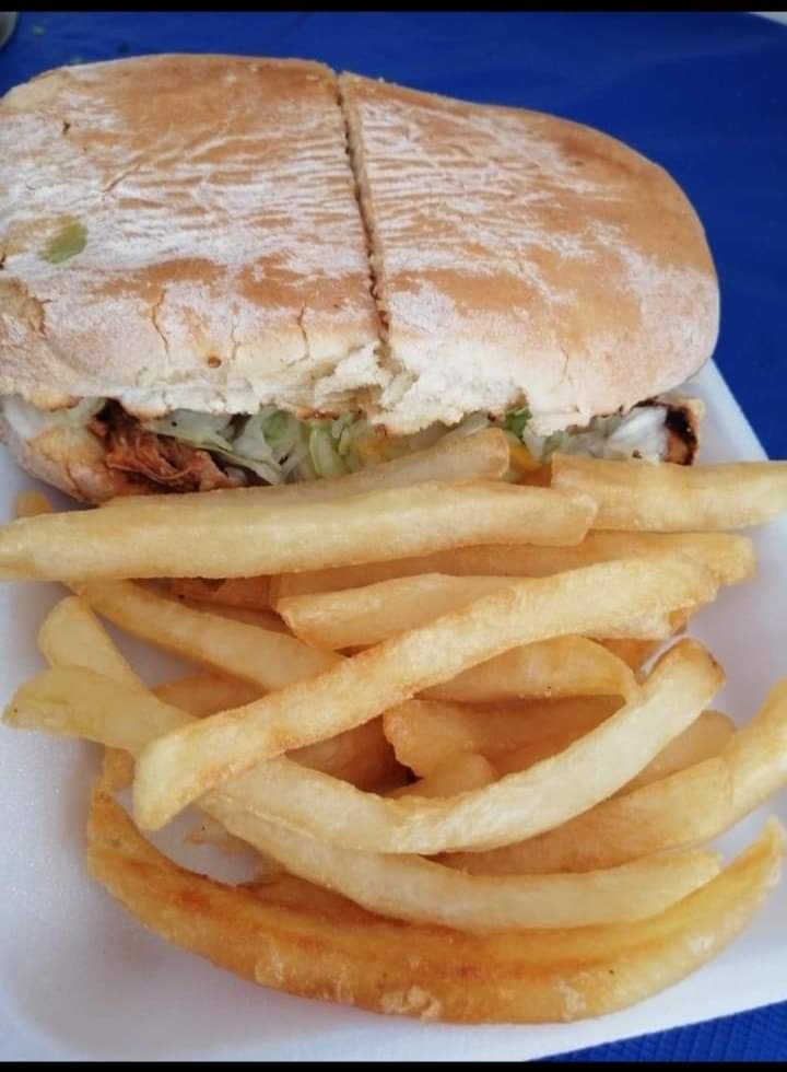 Es de tres pisos, va especial con jamón, queso amarillo, pierna lechuga, tómate, cebolla, aguacate, crema. ( sin Papas)