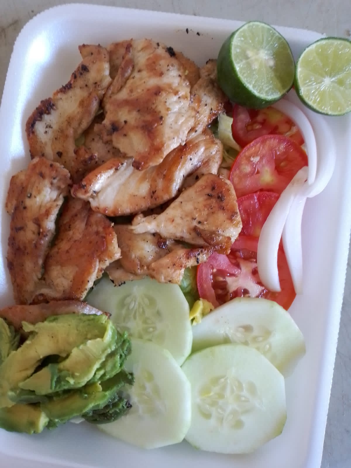 Pollo, su verdura lechuga, tómate, cebolla, aguacate . (Sin Papas)