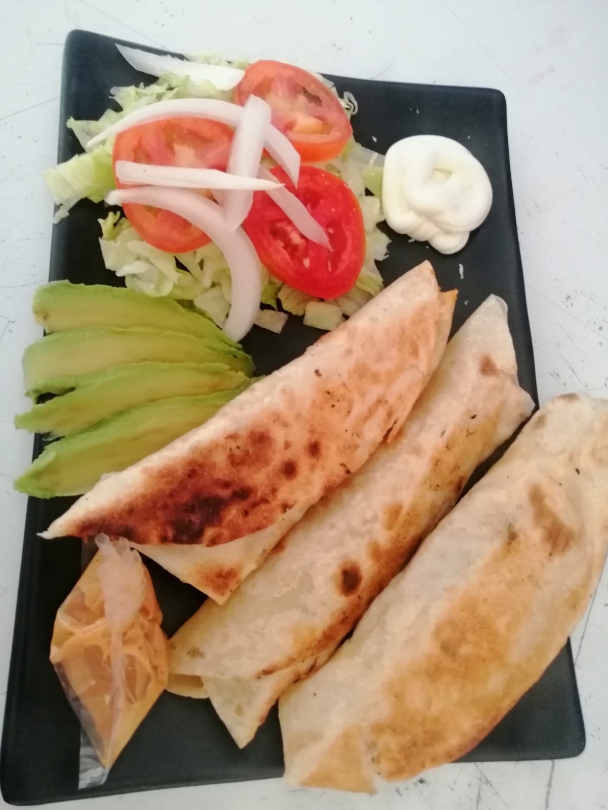 Pollo, frijoles, queso chihuahua su verdura aparte lechuga tomate cebolla cada uno.