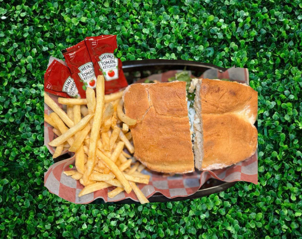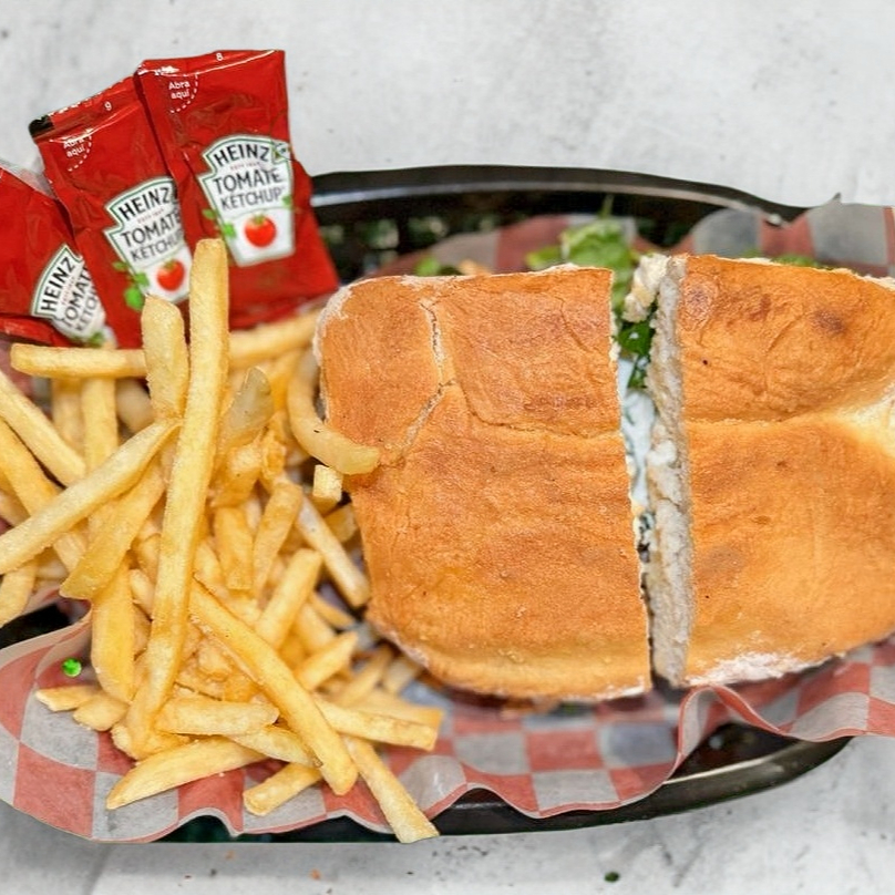 Pechuda de Pollo, Mayonesa, Crema, Tomate, Cebolla, Lechuga y Aguacate.