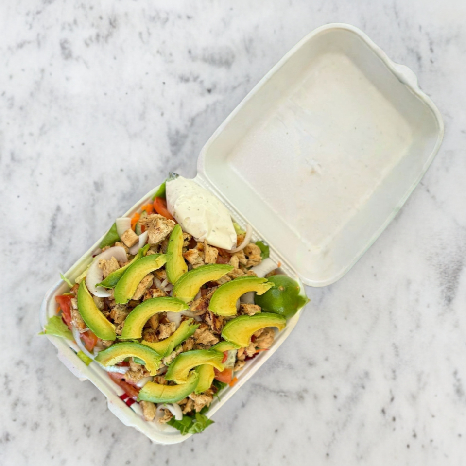 Lechiga, tomate, cebolla, aguacate, aceituna negra, manzana y cubos de pechiga de pollo asada. Acompañada de baguette y nuestra alsa de cacahuate.