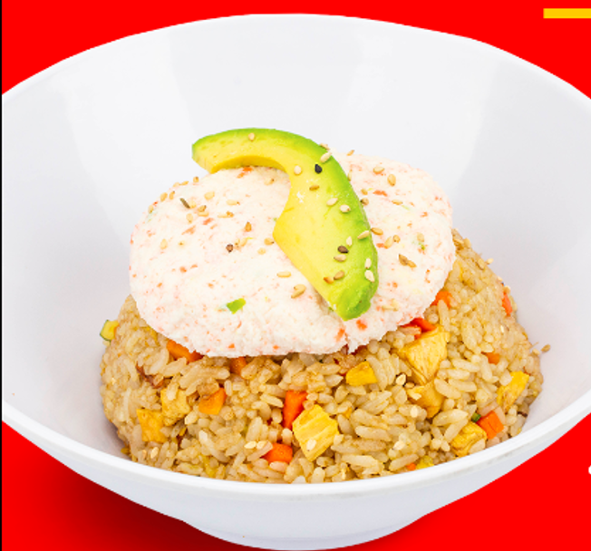 Arroz frito con verduras y topping de tampico, philadelfia, aguacate y ajonjoli