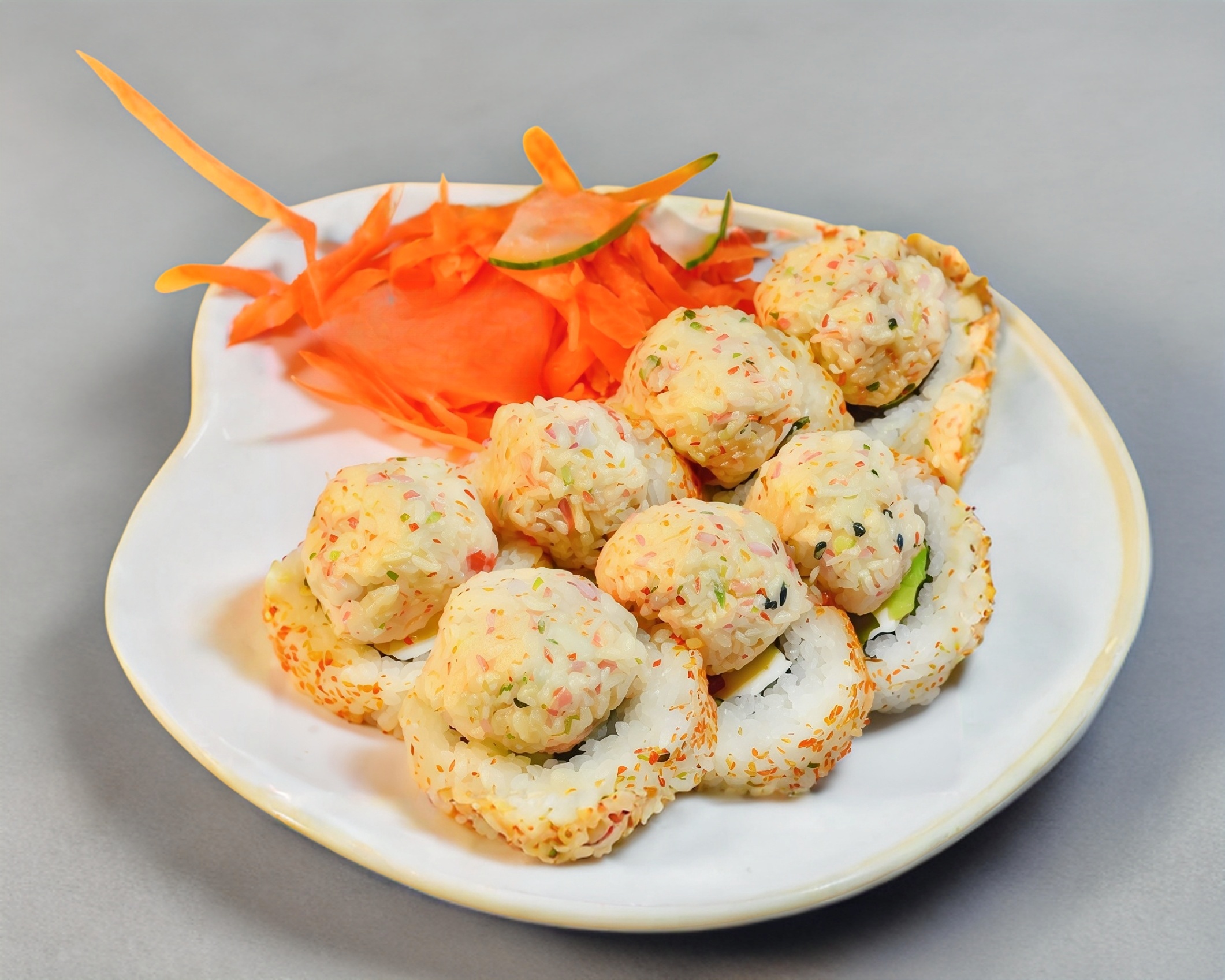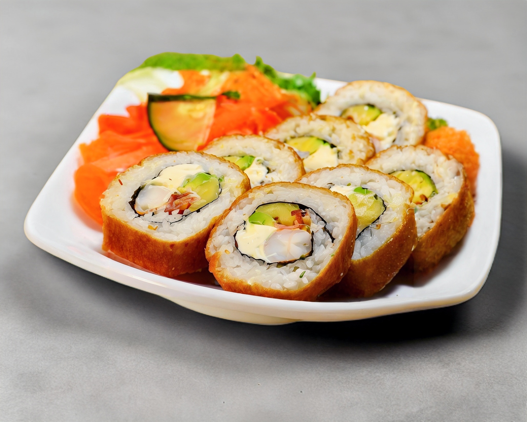 Relleno: pepino, aguacate, philadelphia, camarón, cangrejo, salmón y massago