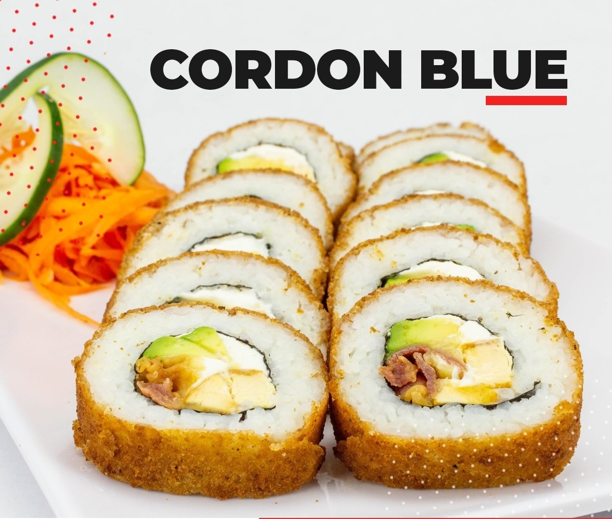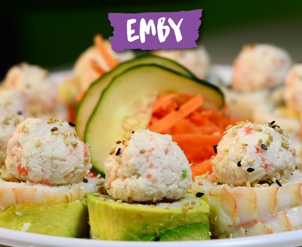 Relleno: aguacate, Philadelphia, pepino, camarón o cangrejo Afuera: ajonjolí