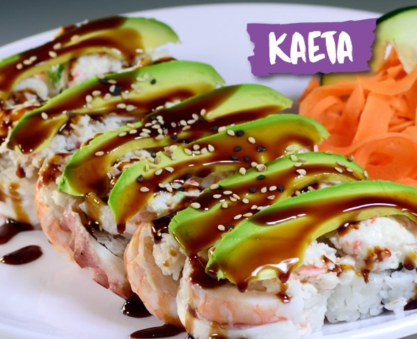 Relleno: aguacate, philadelphia, pepino y camaron Afuera: pasta tampico Arriba: salsa de anguila, aguacate y ajonjolí