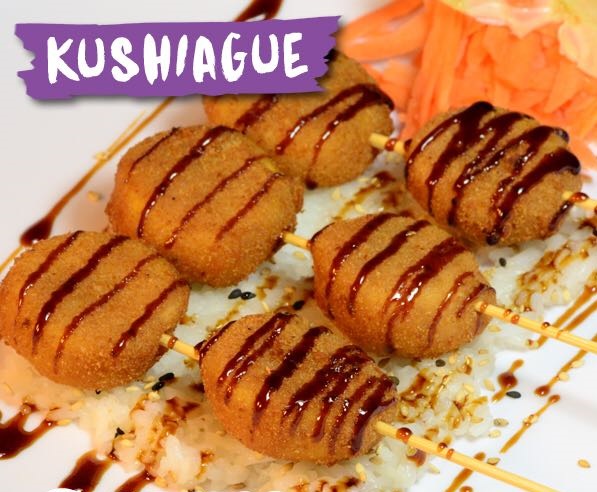 3 Brochetas empanizadas, en una cama de arroz blanco, bañadas con salsa de anguila y ajonjolí.