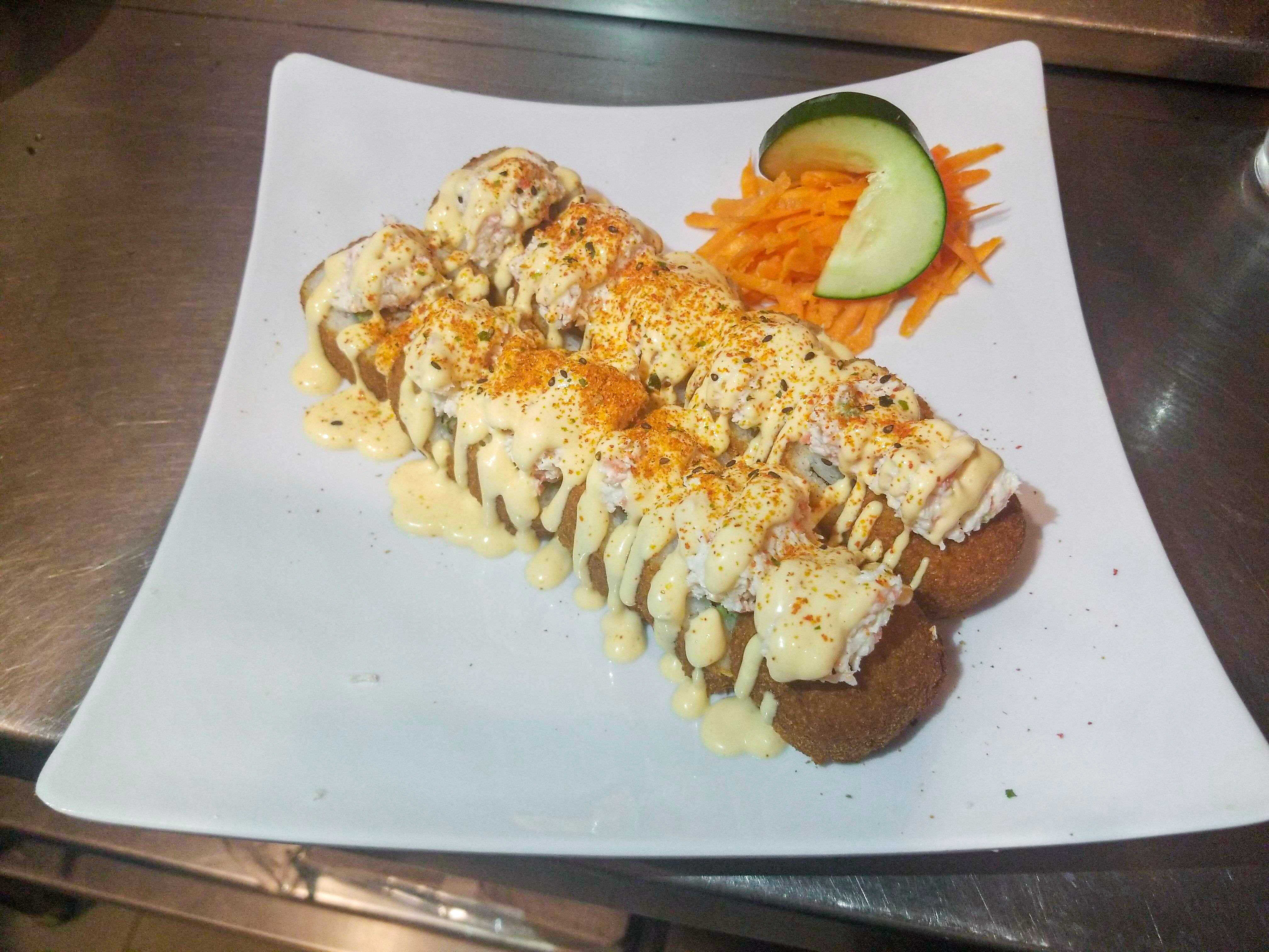Relleno: camarón empanizado, philadelfia y pepino Arriba: aderezo jalapeño con un toque de salsa de anguila